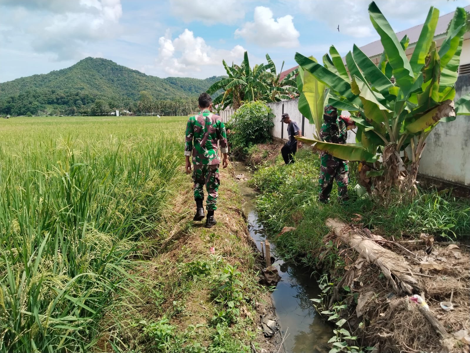 Luwu – Dalam upaya menjaga kebersihan dan kelancaran aliran air bagi persawahan, personel Koramil 02/Suli melaksanakan kegiatan Karya Bakti pembersihan saluran irigasi di Lingkungan Lempokasi, Kelurahan Suli, Kecamatan Suli, Kabupaten Luwu, pada Selasa (04/03/2025) pukul 08.30 WITA.