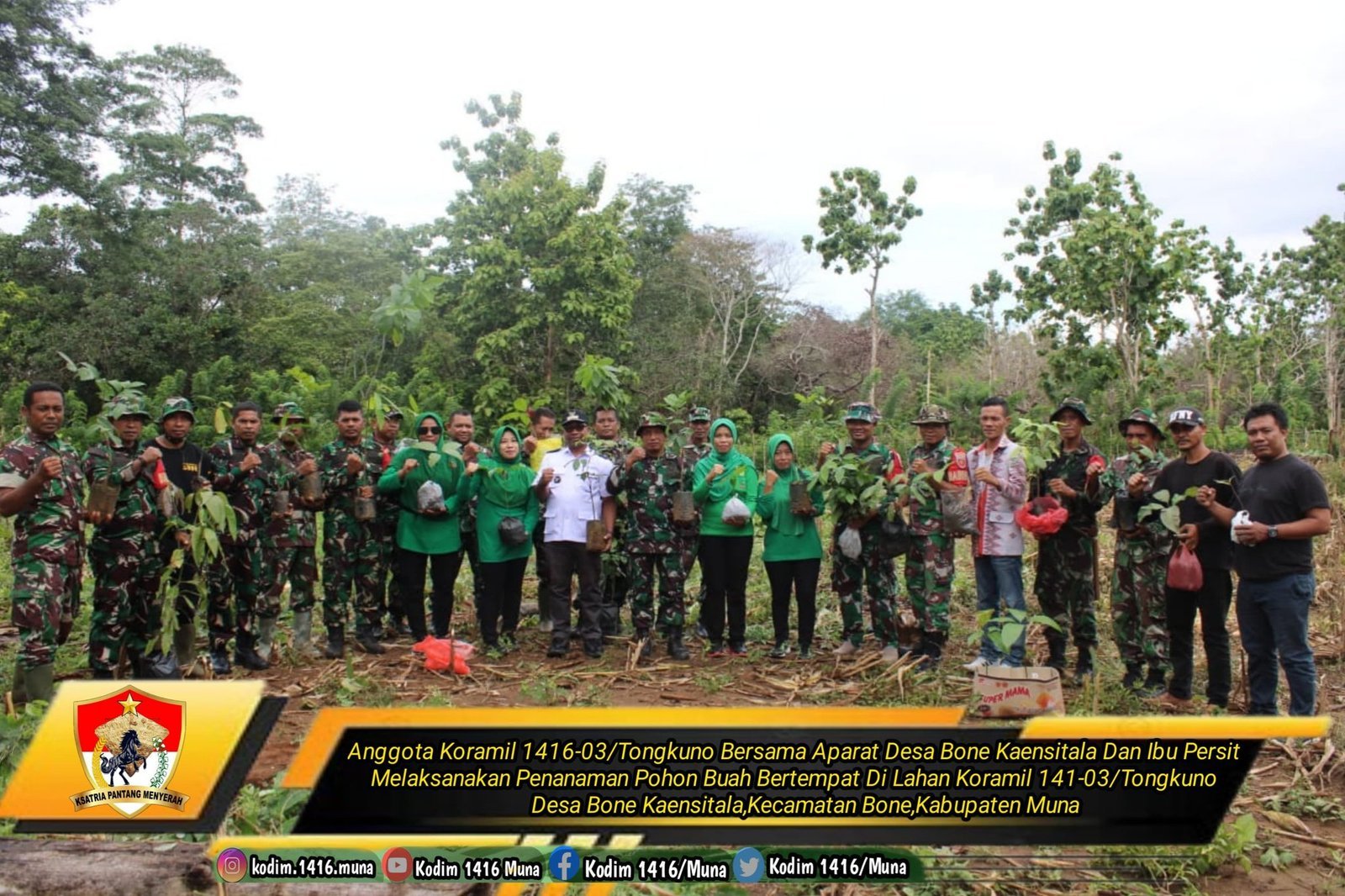 Kegiatan ini turut dihadiri oleh Kepala Desa Bone Kaensitala, Bapak Marwan, S.H., serta ibu-ibu Persit Kartika Chandra Kirana (KCK) yang turut serta dalam aksi penghijauan ini.