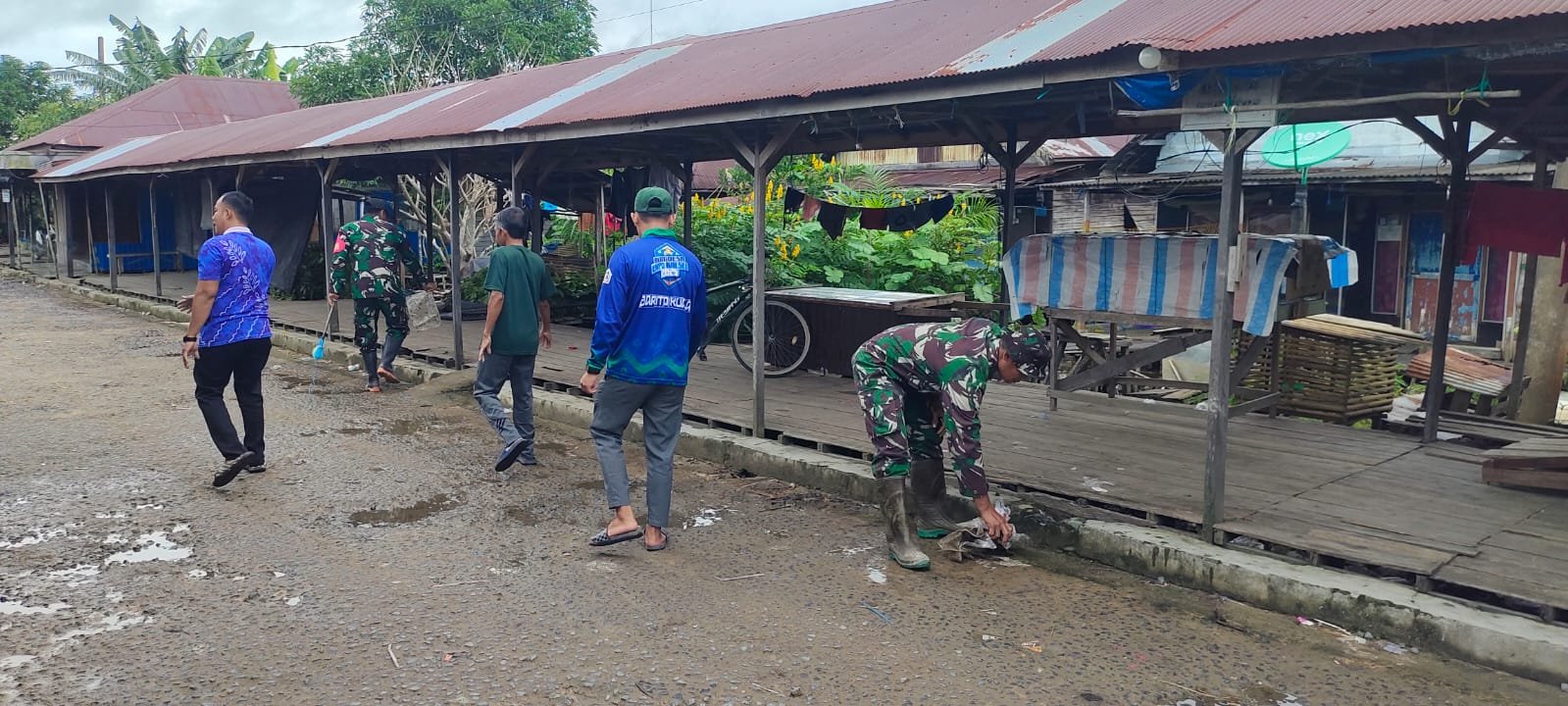 Sebanyak 15 personel turut ambil bagian dalam aksi peduli lingkungan ini, terdiri dari 6 anggota Koramil 1005-02/Kuripan, 3 aparat desa, dan 6 warga masyarakat. Mereka bergotong royong membersihkan area pasar tradisional, mengangkat sampah dari selokan, serta menanam pohon di titik-titik strategis yang rawan genangan air.