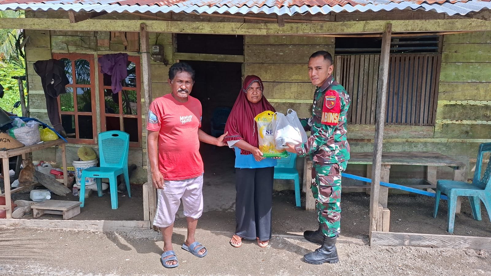 Salah satu warga yang menerima bantuan adalah Pak Ansar, Dalam kesempatan itu, Babinsa menyerahkan paket sembako berisi beras 5 kilogram, telur 1 papan, minyak goreng 1 liter, gula 1 kilogram, dan teh kotak.