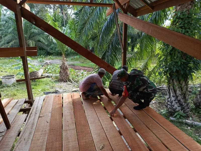 Dalam kegiatan tersebut, Sertu Syamsul bersama masyarakat setempat bekerja sama memasang papan lantai sebagai bagian dari tahapan pembangunan fasilitas keagamaan yang nantinya akan dimanfaatkan untuk kegiatan belajar mengaji dan pembinaan generasi muda di desa tersebut.