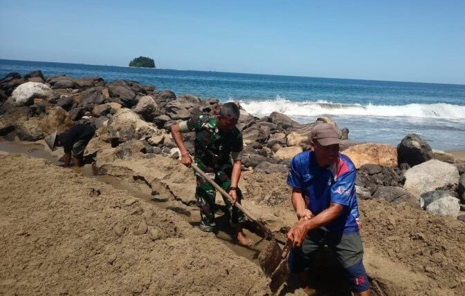 ABDYA – Babinsa Koramil 04/Susoh Kodim 0110/Abdya, Serda Abdul Kadir, bersama warga Desa Ujung Serangga, Kecamatan Susoh, menggelar aksi gotong royong membangun kanal saluran di sepanjang pesisir pantai setempat, Minggu (19/10/2025).