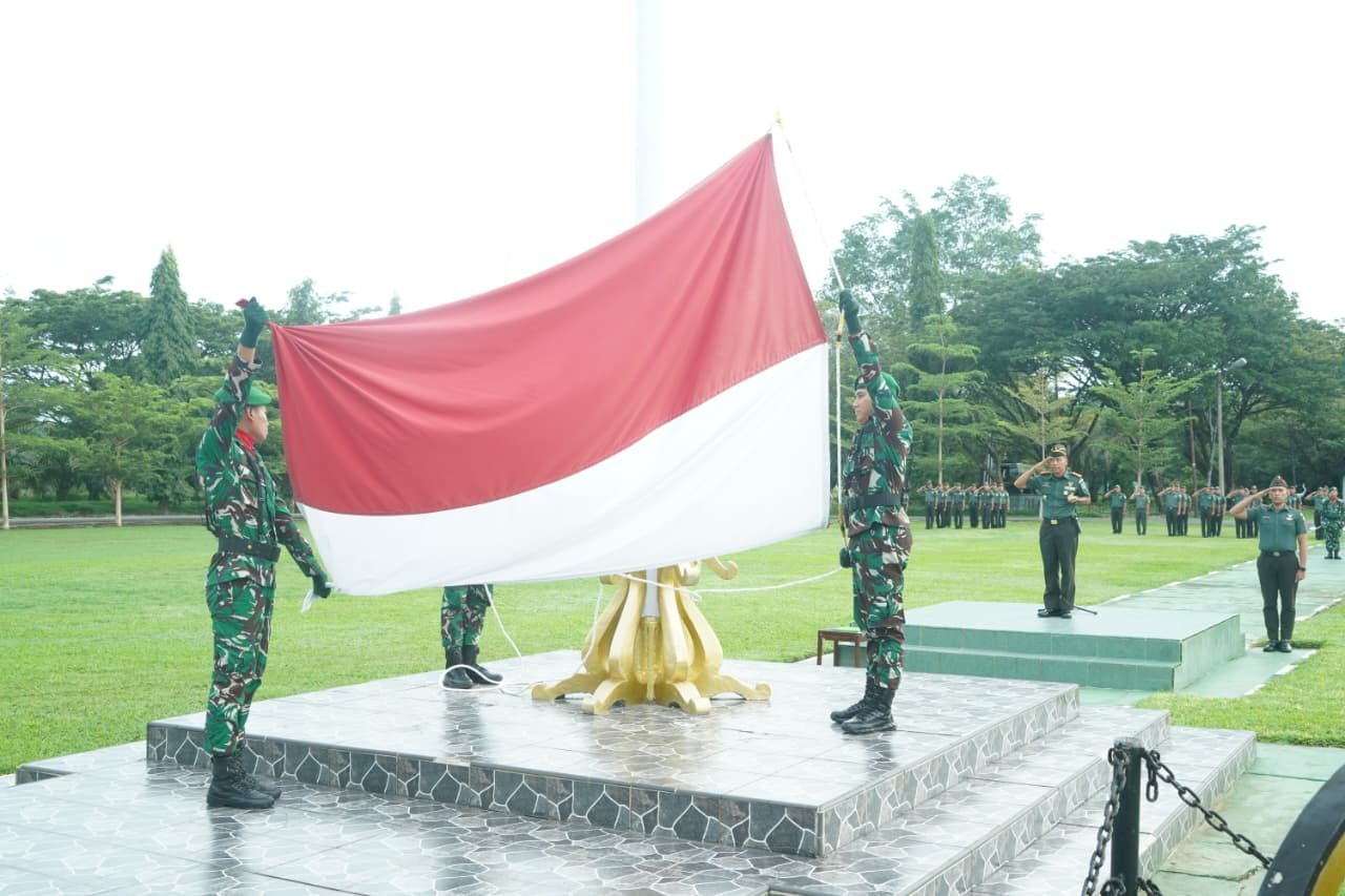 Meulaboh – Korem 012/Teuku Umar menggelar Upacara Bendera Mingguan sebagai bentuk penghormatan terhadap Sang Merah Putih serta untuk memperkuat semangat nasionalisme dan disiplin prajurit. Kegiatan ini berlangsung pada Senin pagi (24/11/2025) di lapangan upacara Makorem, Desa Ujong Tanoh Darat, Kecamatan Meureubo, Kabupaten Aceh Barat.