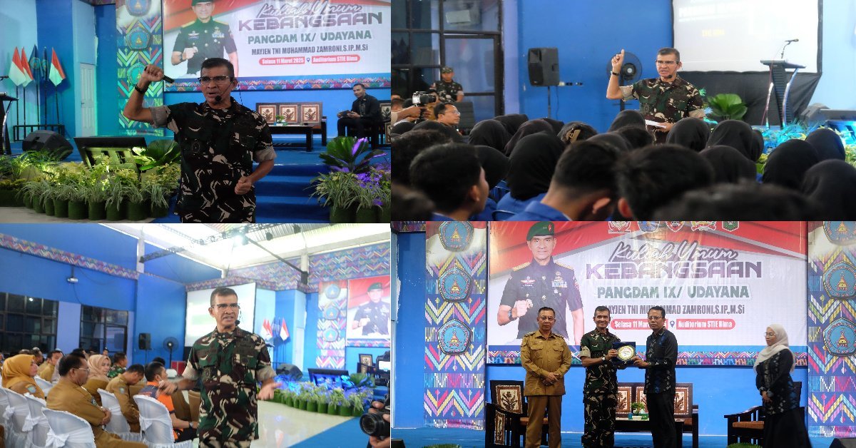 Kota Bima, 11 Maret 2025 – Bertempat di Aula Kampus Sekolah Tinggi Ilmu Ekonomi (STIE) Bima, Pangdam IX/Udayana Mayjen TNI Muhammad Zamroni, S.I.P, M.Si memberikan Kuliah Umum Kebangsaan kepada ratusan mahasiswa. Kegiatan ini dihadiri oleh sekitar 750 peserta yang terdiri dari mahasiswa, dosen, serta berbagai elemen masyarakat dan pemerintah daerah Kota Bima.