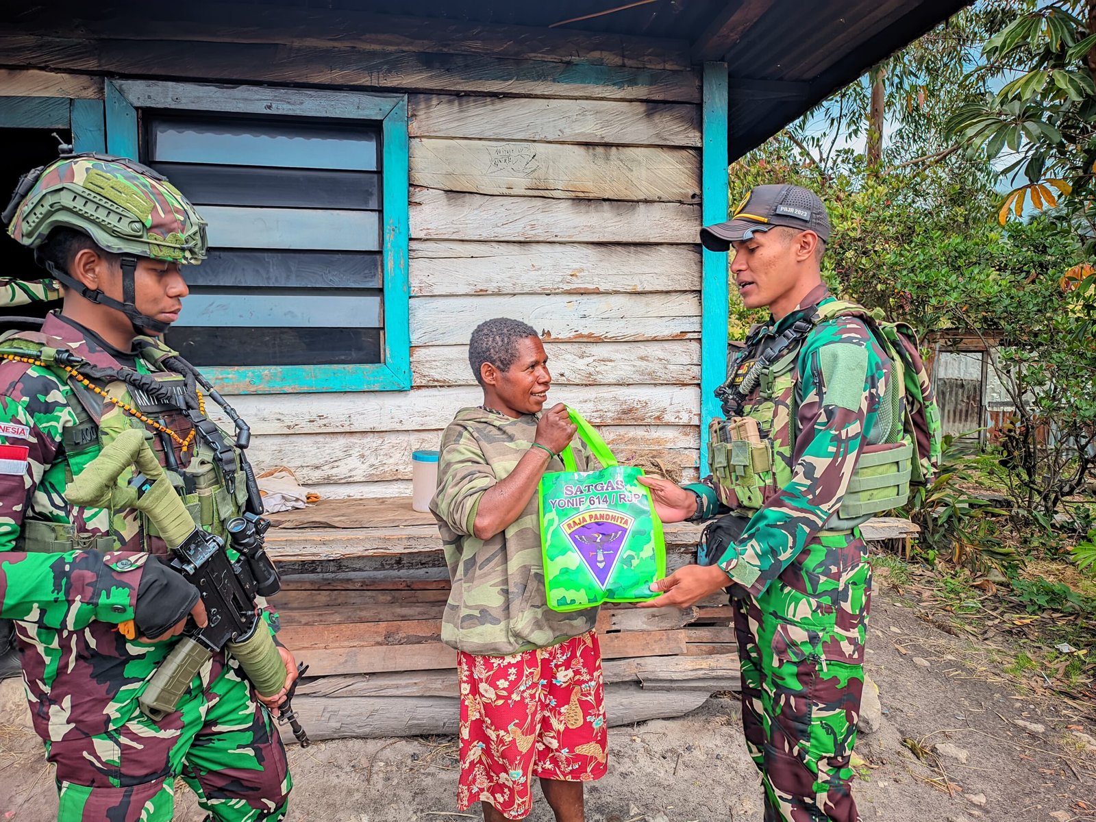 LANNY JAYA – Personel Pos Malagayneri Satgas Pamtas RI-PNG Kewilayahan Yonif 614/RJP melaksanakan kegiatan berbagi kasih dengan membagikan paket Sembako kepada warga di Kampung Lowanom, Distrik Malagayneri, Kabupaten Lanny Jaya Papua Pegunungan, Senin (14/7/2025).