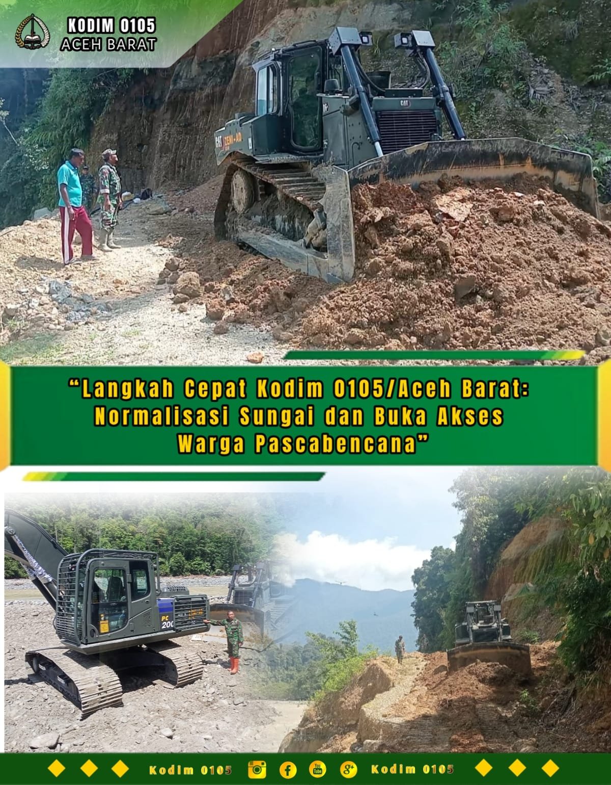 ACEH BARAT – Upaya pemulihan pascabencana banjir terus dilakukan oleh TNI AD melalui Kodim 0105/Aceh Barat. Salah satu langkah konkret yang dilakukan adalah dengan mengerahkan alat berat untuk membuka kembali akses Jalan Jambak–Sikundo yang sebelumnya terhenti akibat terjangan banjir dan longsoran material, Selasa (20/01/2026).