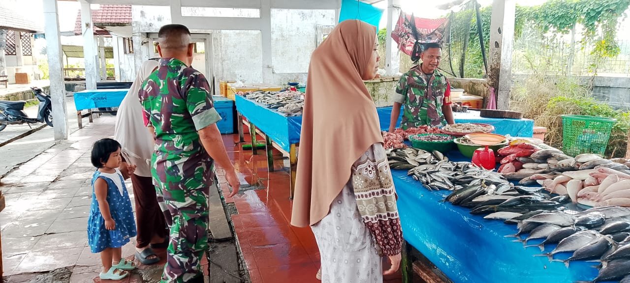 Dalam kesempatan itu, para Babinsa menyempatkan diri berdialog secara langsung dengan pedagang ikan yang sedang berjualan di area pasar. Percakapan berlangsung dengan suasana santai namun penuh keakraban.