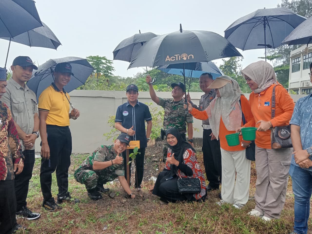Meski diguyur hujan, semangat peserta tidak surut dalam melakukan penghijauan. Kegiatan ini turut dihadiri pejabat Forkopimda, TNI-Polri, Dirut PT Mitra Pelabuhan Mandiri (Pelabuhan Jetty), tokoh agama, tokoh masyarakat, serta komunitas Gerakan Peduli Lingkungan (GPL).(0105).