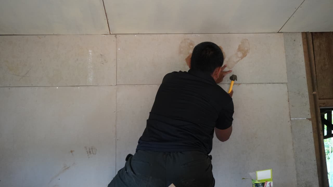 Setelah proses struktur dan dinding selesai, Satgas TMMD melanjutkan pengerjaan bagian atas rumah guna menyempurnakan bangunan agar lebih nyaman dan layak huni. Pemasangan plafon dilakukan dengan cermat untuk memastikan hasil yang rapi dan kuat.