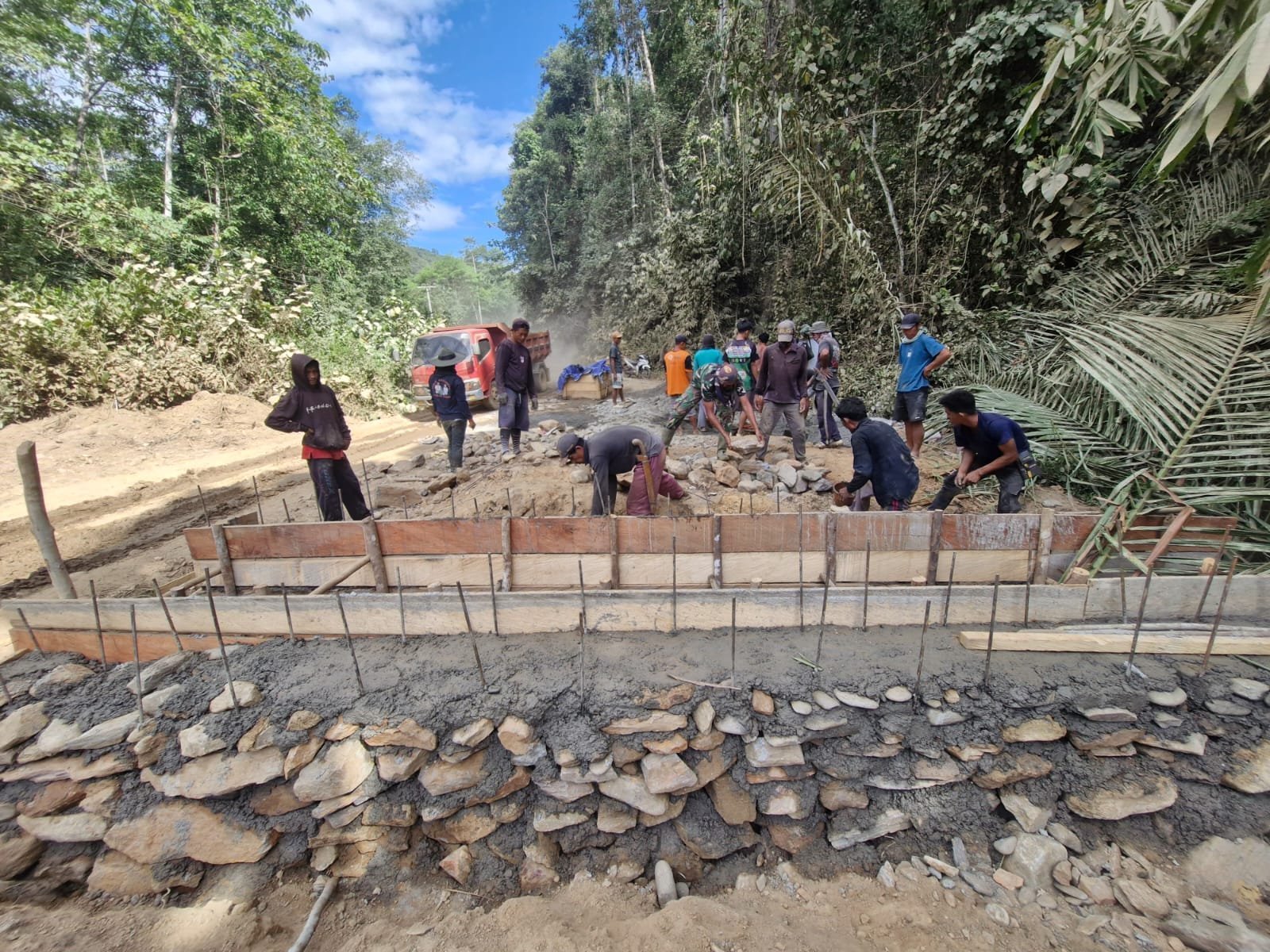Sejak pagi, warga bersama anggota Satgas bahu-membahu mengangkut pasir, kerikil, dan semen ke lokasi kerja. Mereka bekerja dengan penuh semangat tanpa mengenal lelah, menunjukkan kekompakan dan rasa kebersamaan yang menjadi ciri khas kemanunggalan TNI dan rakyat.
