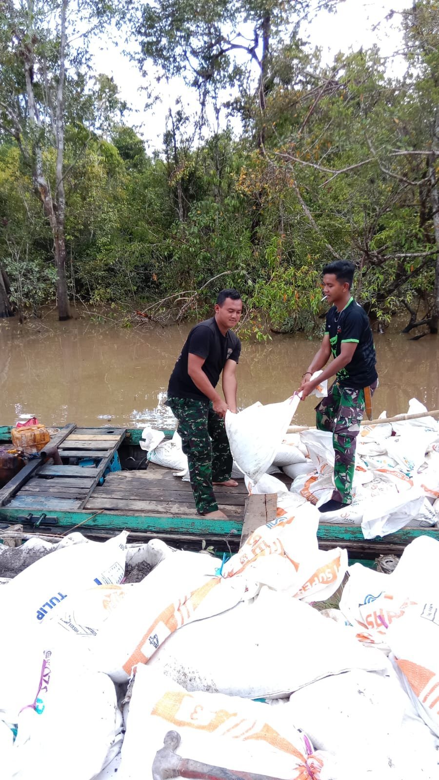 Warga bersama Satgas TMMD terlibat aktif dalam proses penurunan dan pengangkutan material ke titik-titik sasaran yang sulit dijangkau kendaraan, termasuk dengan menggunakan gerobak dorong dan pikulan manual.