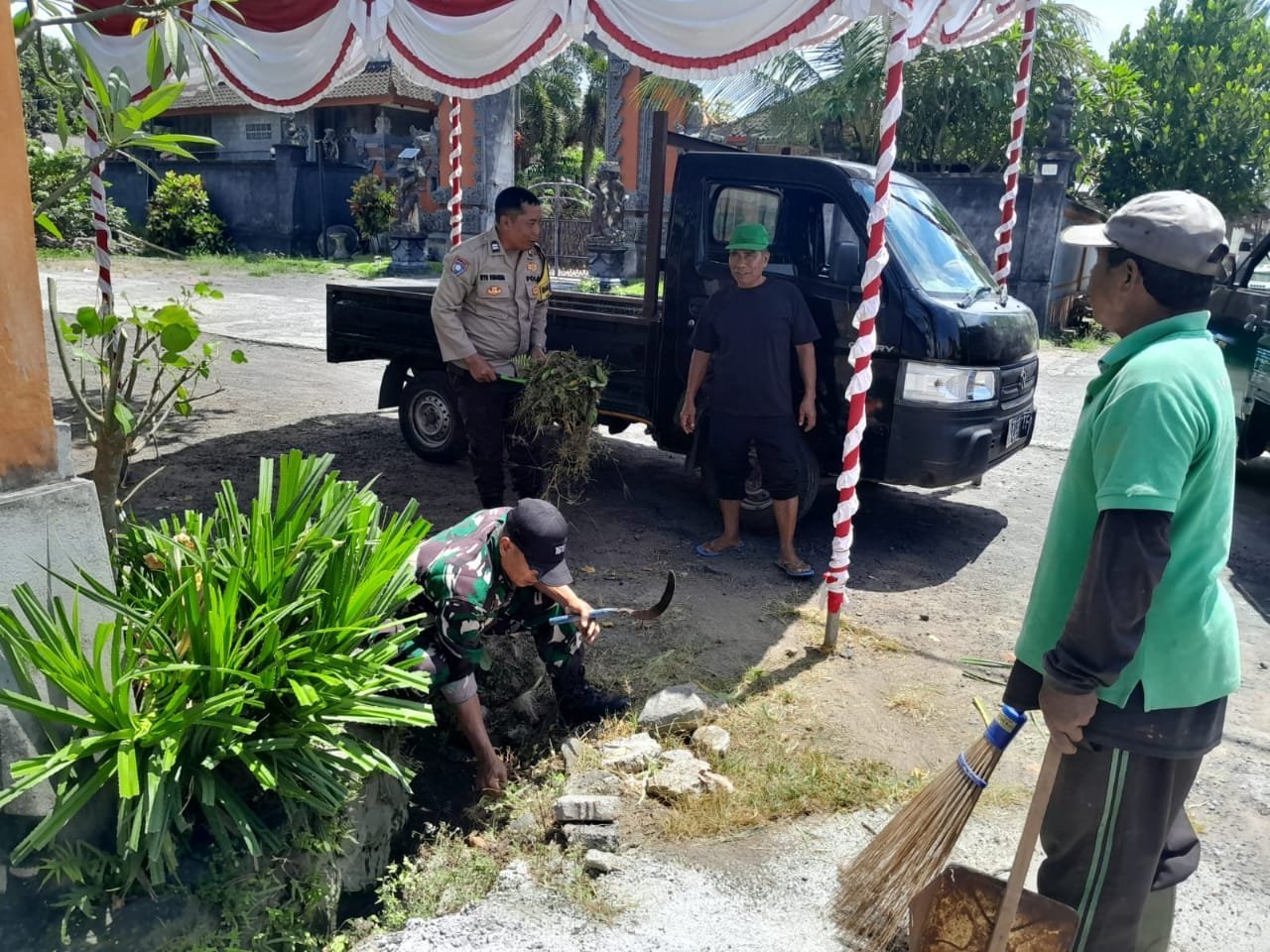 Pagi ini bersinergi bersama Bhabinkamtibmas dan perangkat desa kita lakukan aksi bersih-bersih lingkungan dengan menyasar kantor desa dan balai banjar adat negari,”ucap Serka Gede.
