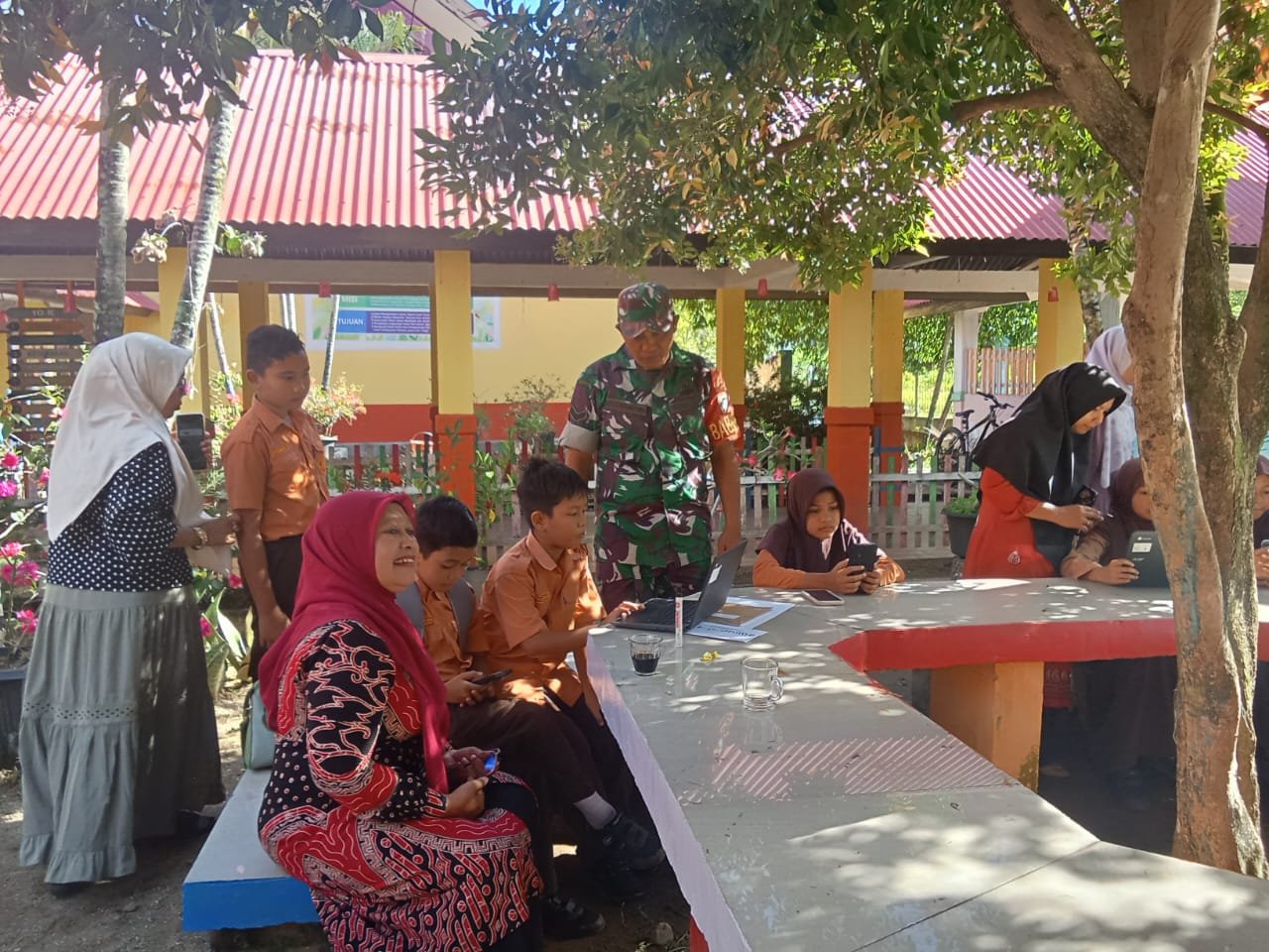 ACEH JAYA – Babinsa Koramil 03/Setia Bakti Kodim 0114/Aceh Jaya, Sertu Marwansah, melaksanakan kegiatan komunikasi sosial (komsos) bersama para guru di SD Negeri 3 Setia Bakti, Kecamatan Setia Bakti, Kabupaten Aceh Jaya, Sabtu (11/04/2026). Kegiatan tersebut dilakukan saat para guru sedang melaksanakan proses penilaian terhadap peserta didik sebagai bagian dari evaluasi pembelajaran.
