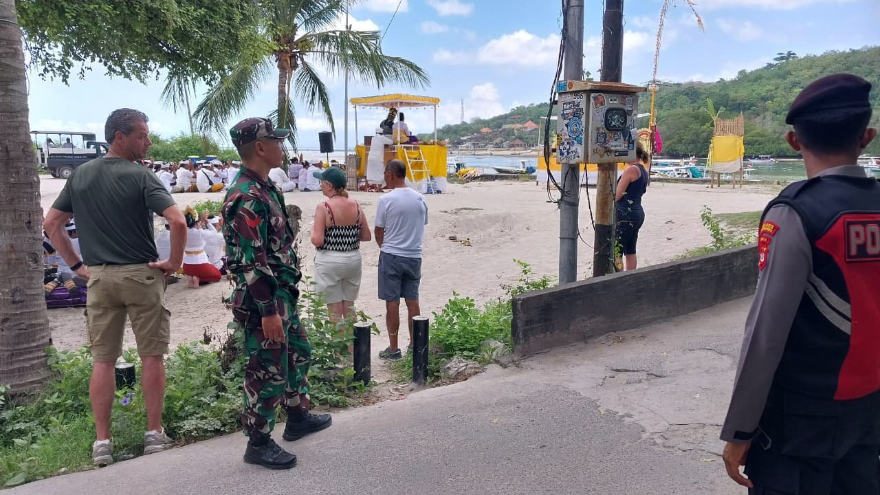 Bersinergi bersama Bhabinkamtibmas dan pecalang desa, hari ini kita berikan pelayanan bantuan pengawalan dan keamanan terhadap kegiatan persembahyangan dan melasti di Jembatan Kuning, Dusun Ceningan, Desa Lembongan, “terangnya.