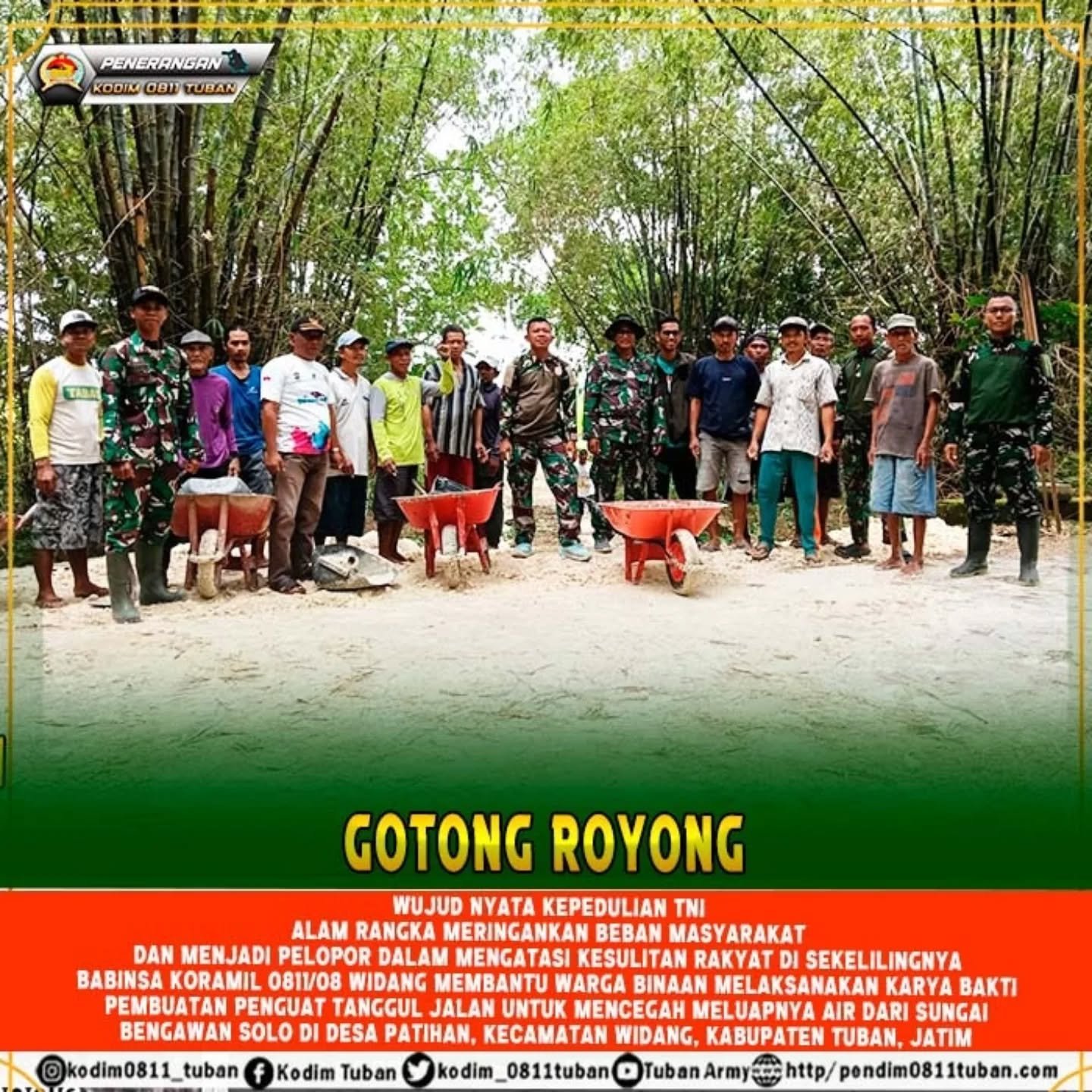 Babinsa Koramil 0811/08 Widang menyampaikan bahwa kegiatan karya bakti ini merupakan bagian dari tugas pembinaan teritorial, sekaligus bentuk pengabdian TNI dalam membantu mengatasi kesulitan masyarakat di wilayah binaan.