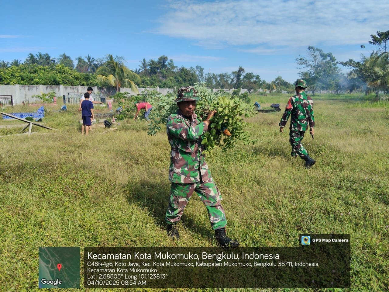 Mukomuko – Dalam upaya menjaga kebersihan Personel Kodim 0428/Mukomuko bersama masyarakat dikelurahan Koto Jaya Kec. Kota Mukomuko Kab. Mukomuko, bergotong royong membersihkan area tempat pemakaman Umum TPU, Sabtu(04/10/2025).