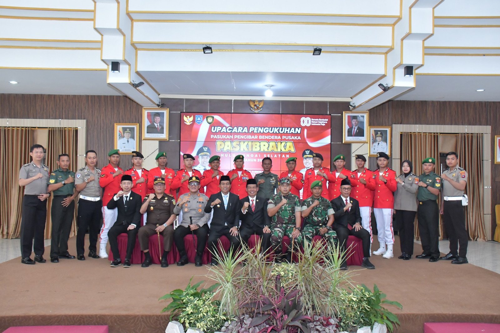 HULU SUNGAI SELATAN – Berlokasikan di Pendopo Bupati Hulu Sungai Selatan (HSS) Jl. A. Yani Kabupaten HSS, Komandan Kodim 1003/HSS Letkol Inf Putut Januarto bersama unsur Forum Komunikasi Pimpinan Daerah (FKPD) yang dipimpin Bupati HSS H Syafrudin Noor telah menggelar prosesi pengukuhan 32 anggota Pasukan Pengibar Bendera Pusaka (Paskibraka). Jumat (15/8/25)