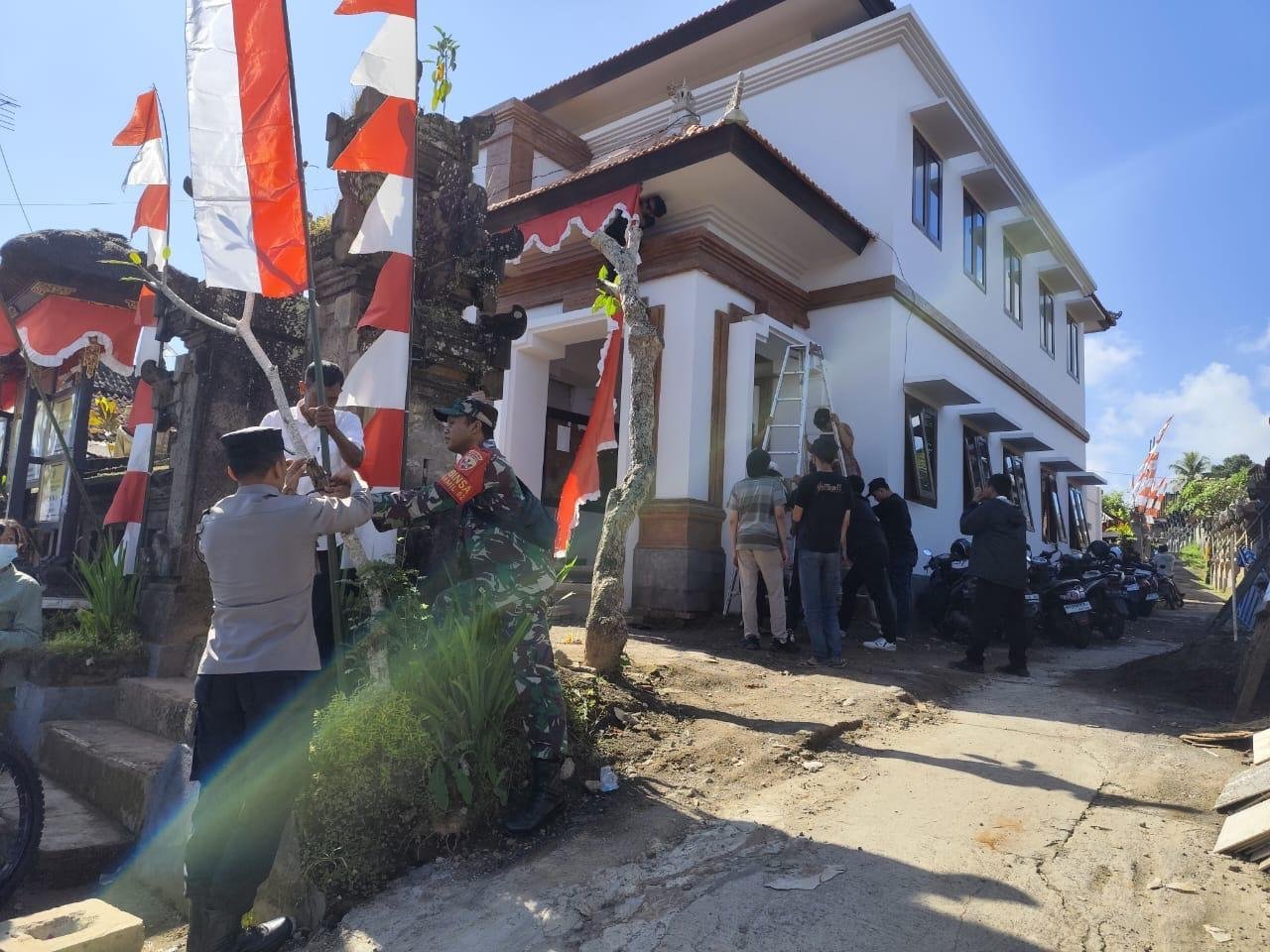 Kaliini dengan bersinergi bersama staf desa dan mahasiswa KKN Unud, Babinsa Serda Kadek Dwi Awan menghias kantor desa Timuhun dengan nuansa merah putih, Rabu ( 06/08/25 ).