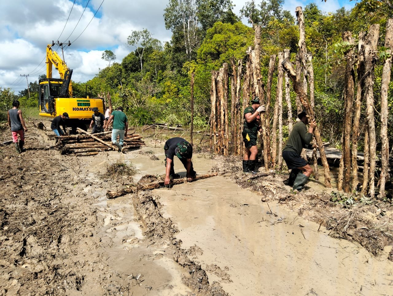 Barito Selatan – Di tengah terik matahari dan medan berlumpur, Satgas TMMD Kodim 1012/Buntok bersama masyarakat Desa Talio, Kecamatan Karau Kuala, tetap giat melaksanakan pemasangan cerucuk kayu sebagai bagian dari pembukaan jalan. Kegiatan gotong royong ini menjadi bukti nyata kebersamaan dan semangat juang warga dengan TNI.