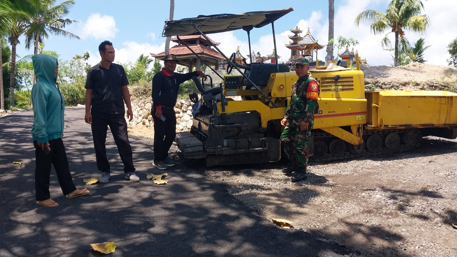Klungkung,- Sebagai bentuk dukungan dan kontribusi terhadap kelancaran pembangunan di wilayah binaan, Babinsa Pejukutan Koramil 1610-04/Nusa Penida Serka Komang Suwina bersama Perbekel dan tim verifikasi Desa Pejukutan melaksanakan monitoring dan peninjauan lapangan pengerjaan pengaspalan Colmix di Desa Pejukutan, Kecamatan Nusa Penida, Kabupaten Klungkung, Sabtu ( 18/10/25 ).