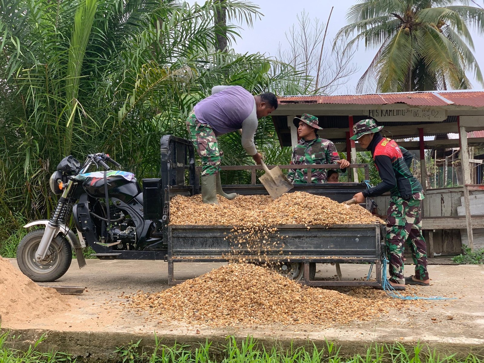 Barito Selatan – Satgas TMMD Kodim 1012/Buntok kembali menunjukkan inovasi dalam pelaksanaan tugas dengan menggunakan motor roda tiga yang dilengkapi bak untuk mengangkut pasir di lokasi TMMD Ke-124. Cara ini dinilai efisien untuk menghadapi medan yang sulit dan jalur yang sempit di kawasan sasaran.