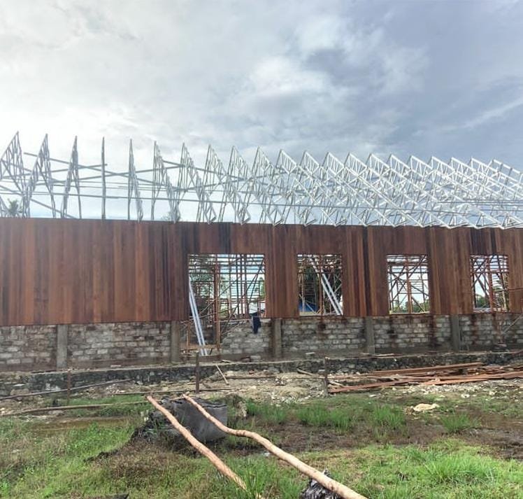 Pekerjaan pembangunan Gereja Talitakum dalam program TMMD ke-125 TA. 2025 Kodim 1705/Nabire terus menunjukkan progres signifikan. Pada Rabu (30/07/2025), proses pembangunan memasuki tahap penting, yaitu pemasangan kerangka atap menggunakan material baja ringan.