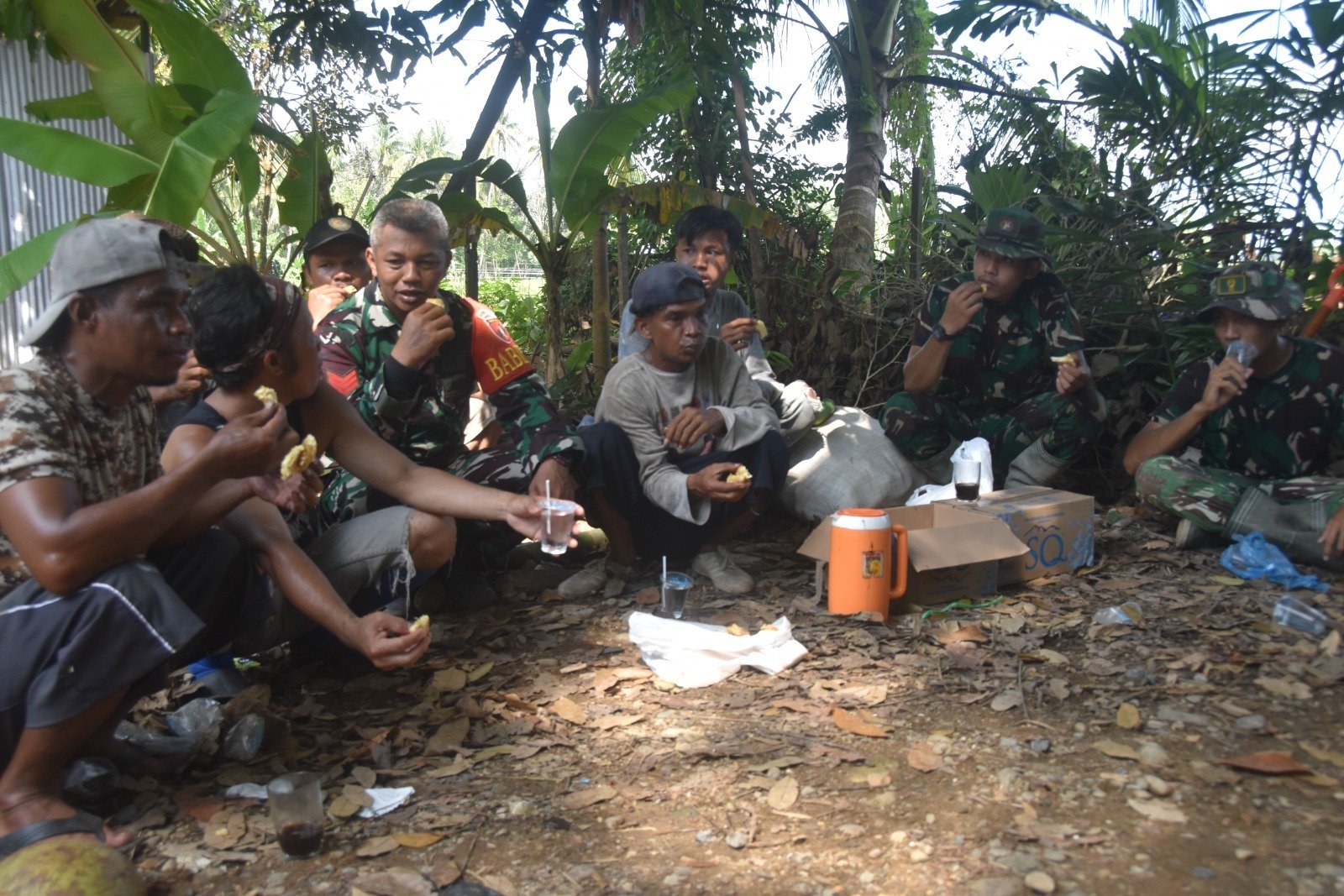 Potret humanis penuh canda tawa tersebut terpantau di lokasi sasaran fisik utama perbaikan, pengecoran, dan peningkatan mutu jalan sepanjang 1000 meter di Desa Pantai Ulin, Kecamatan Simpur, Kabupaten Hulu Sungai Selatan, di mana masyarakat bersama personel Satgas TMMD duduk bersama di sela waktu istirahat dalam pekerjaan.