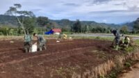 Anggota Satgas TNI Manunggal Membangun Desa (TMMD) Pratu Abdi beserta rekannya ikut turun ke lahan Lanjut Membaca….
