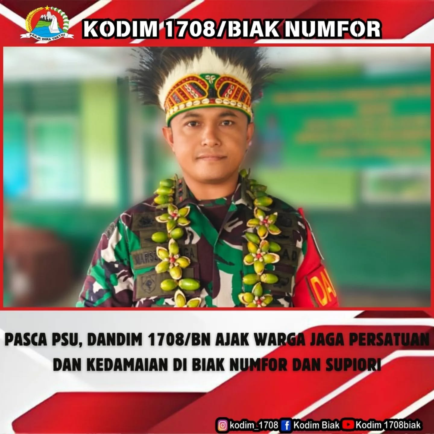 Biak – Dandim 1708/Biak Numfor, Letkol Inf Marsen Sinaga, S.Hub.Int., M.Han, mengajak seluruh masyarakat di Kabupaten Biak Numfor dan Supiori untuk bersama-sama menjaga situasi tetap kondusif dan damai pasca pelaksanaan Pemungutan Suara Ulang (PSU) Pemilihan Gubernur dan Wakil Gubernur Papua Tahun 2025, Sabtu (9/8/2025).