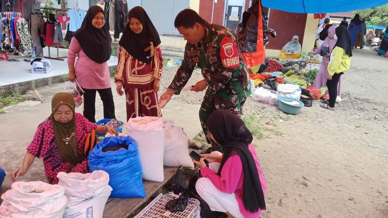 ​Dalam blusukannya ke area pasar, Serka Anwar berinteraksi langsung dengan para pedagang dan pembeli untuk mengecek beberapa komoditas utama.