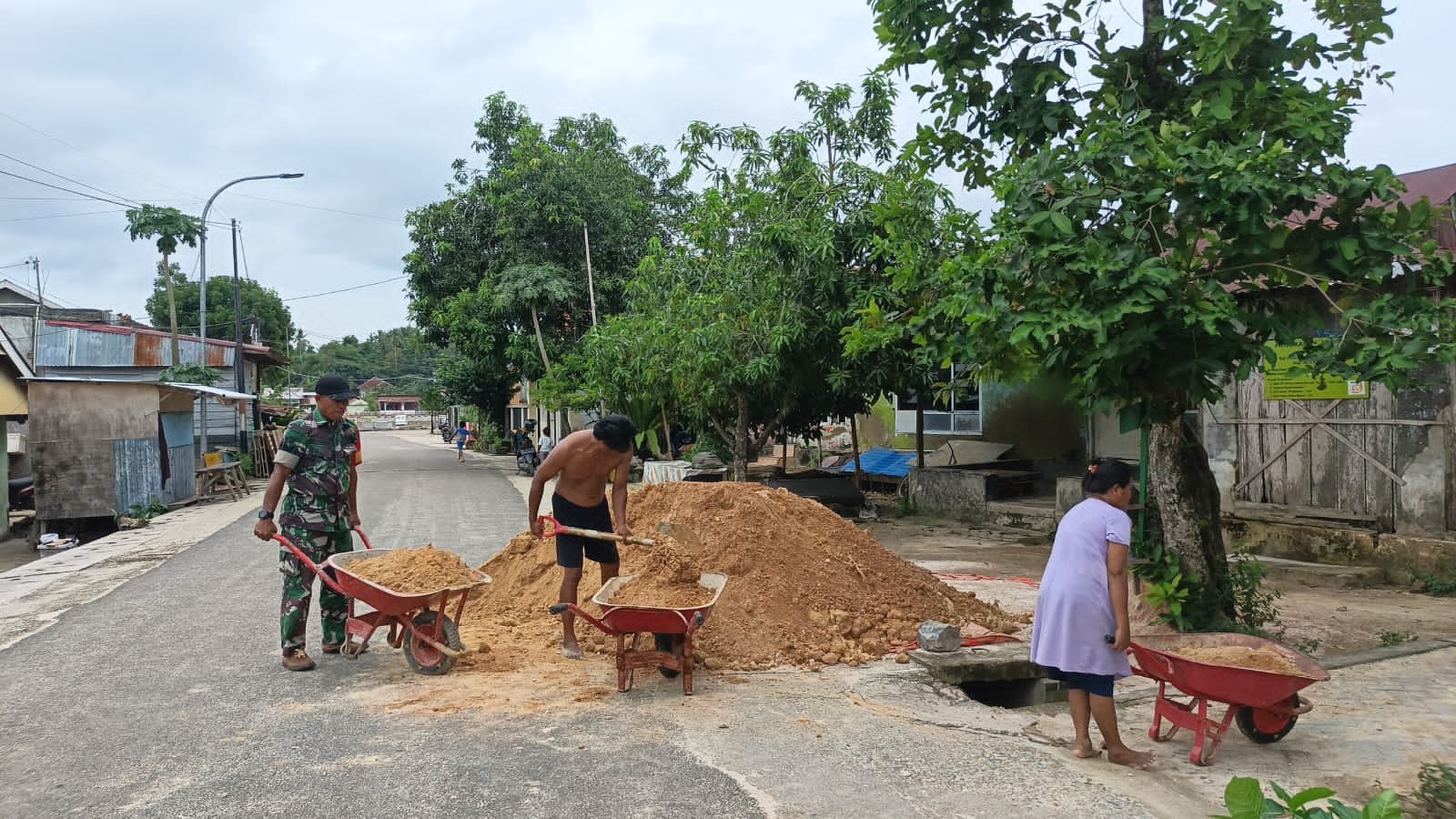 Di tengah aktivitas prajurit, sepasang suami istri setempat secara sukarela turun tangan membantu melansir material timbunan menggunakan gerobak dorong.