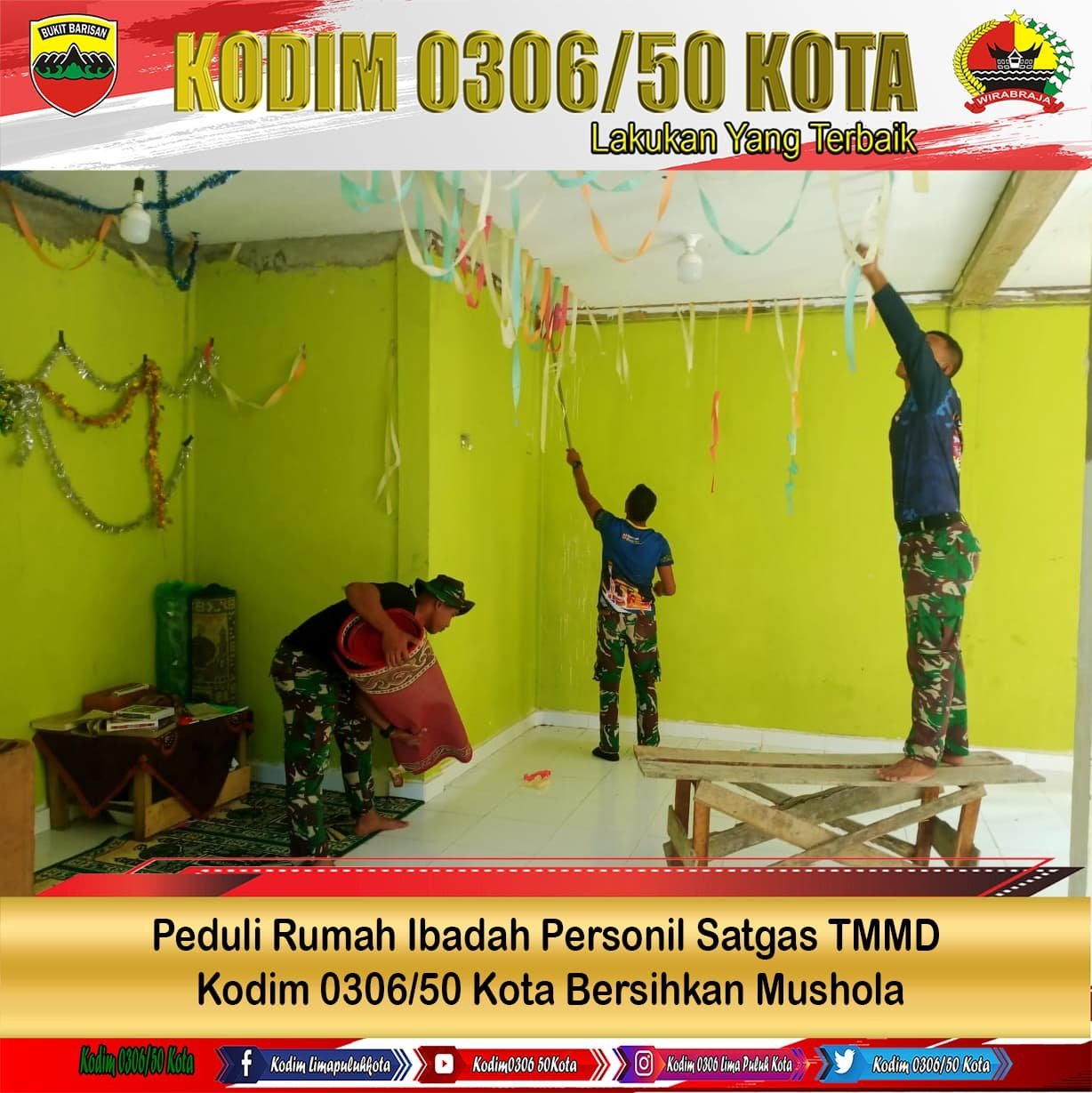 Lima Puluh Kota — Kegiatan Satgas TMMD 124 Kodim 0306/50 Kota mendapat apresiasi warga setempat. Dan kali ini terjun dalam membersihkan lingkungan rumah ibadah dengan menyapu, mengepel, membersihkan kaca jendela serta membersihkan sampah. Jumat (16/5/2025).