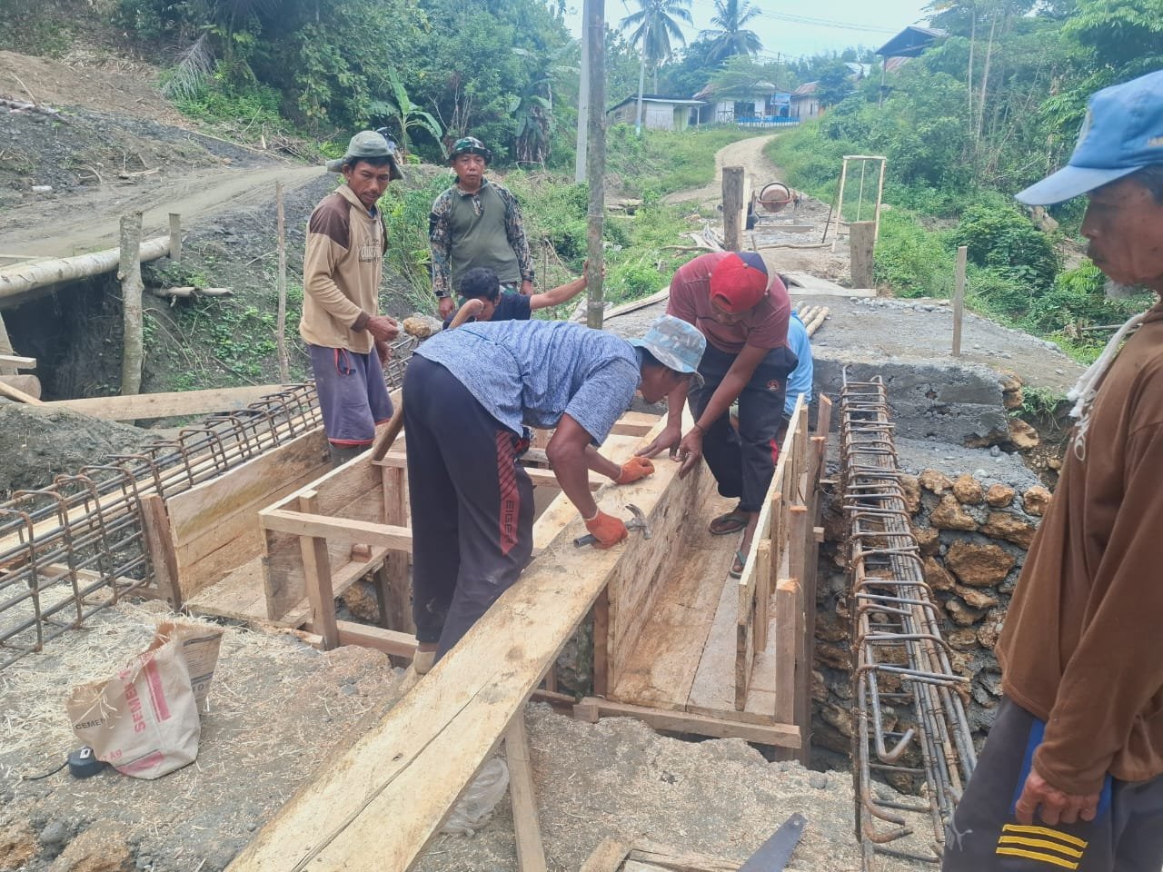 Fokus utama pekerjaan hari ini adalah pembuatan mal cor plat jembatan serta pemasangan besi sebagai tahap akhir sebelum dilakukan pengecoran. Kegiatan ini dilakukan secara gotong royong, melibatkan personel TNI dan warga setempat yang saling bahu-membahu demi percepatan pembangunan.