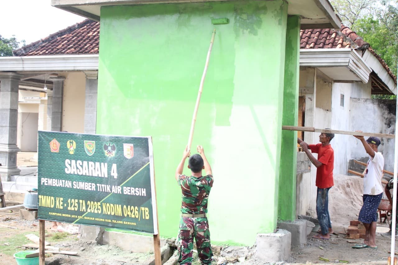 Tulang Bawang, 13 Agustus 2025 – Pembangunan sumur air bersih sasaran 4 dalam program TMMD ke-125 Kodim 0426/Tulang Bawang di Kampung Moris Jaya, Kecamatan Banjar Agung, kini telah mencapai 95 persen. Progres ini menunjukkan bahwa fasilitas vital tersebut segera dapat dimanfaatkan oleh warga setempat.