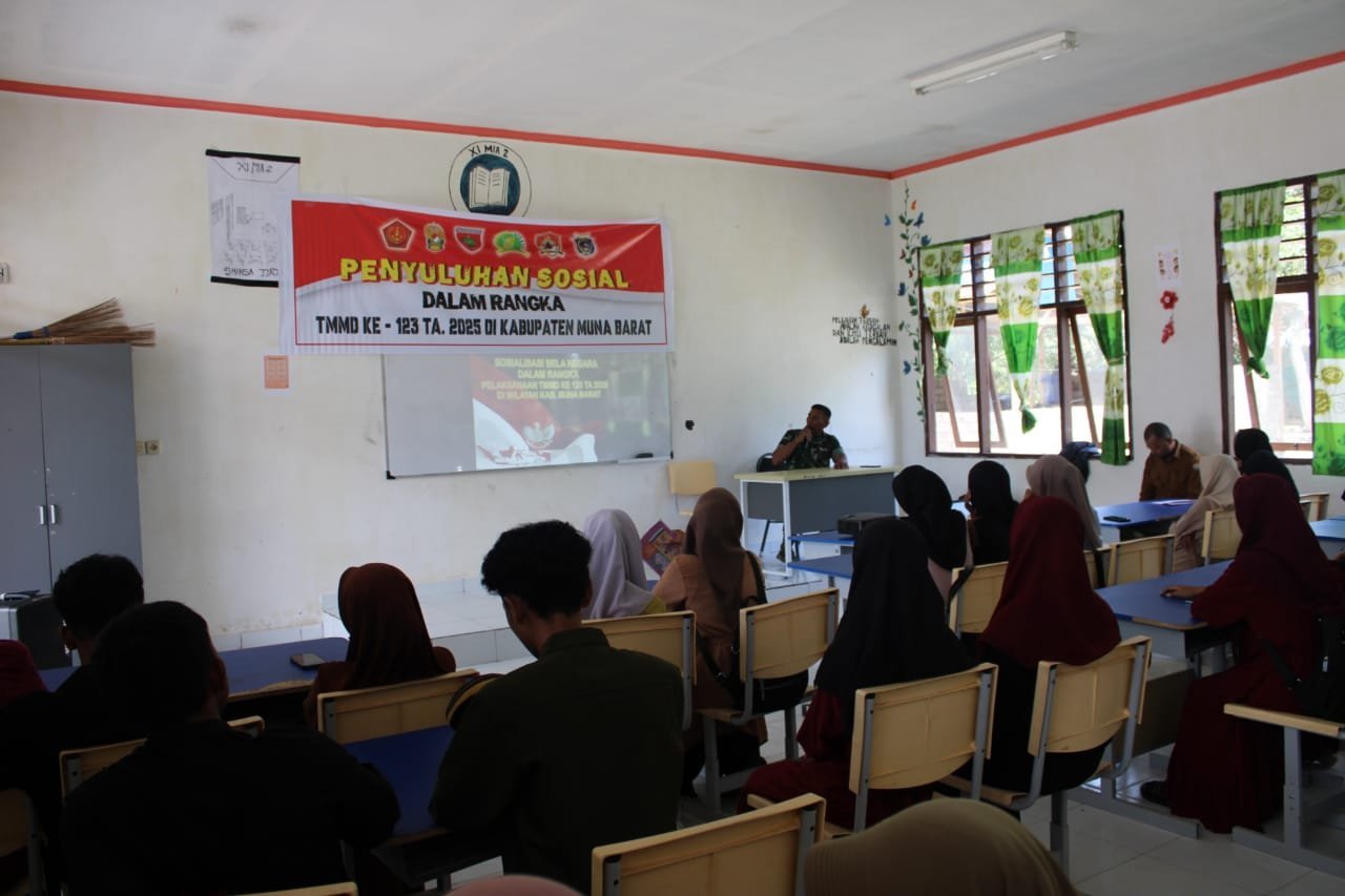 Muna Barat – Sebagai bagian dari sasaran non-fisik dalam program TNI Manunggal Membangun Desa (TMMD) ke-123, Satgas TMMD Kodim 1416/Muna mengadakan penyuluhan Bela Negara di SMAN 1 Tiworo Tengah, Desa Labokolo, Kecamatan Tiworo Tengah, Kabupaten Muna Barat, Selasa (11/03/2025).