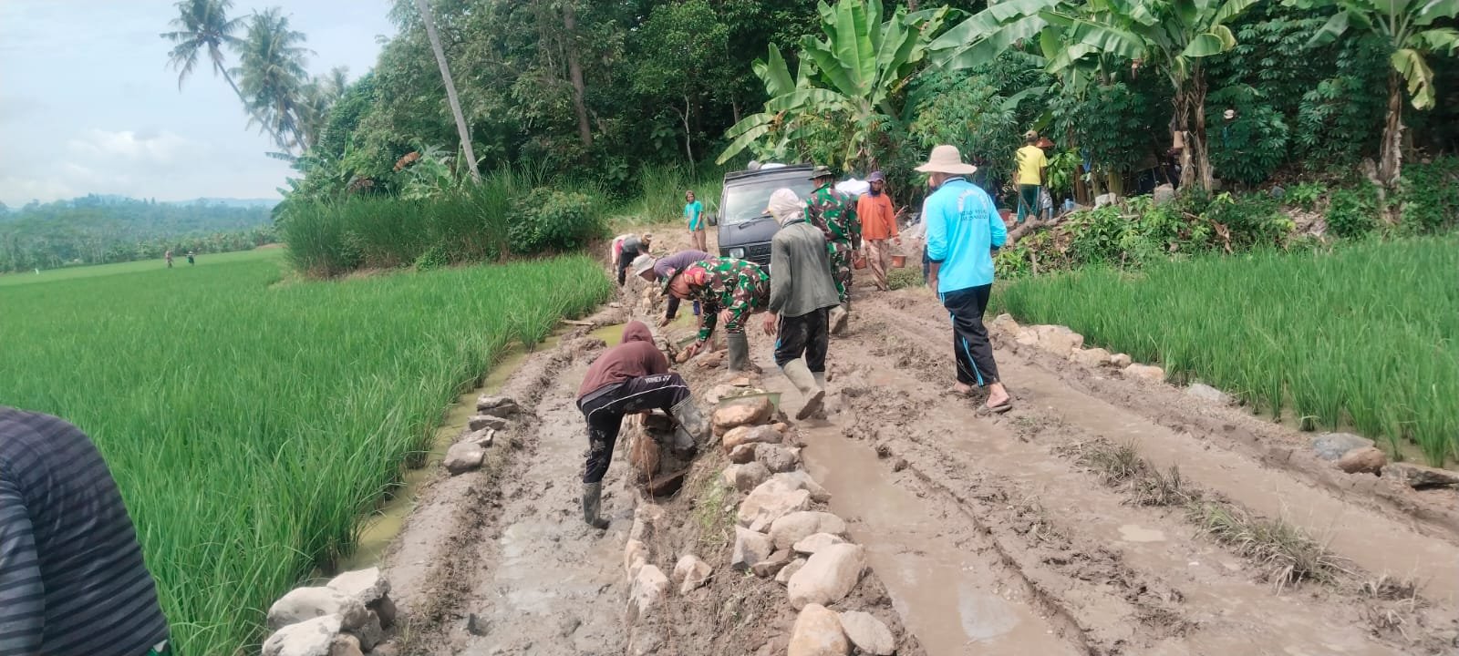 Personel Satgas TMMD mengerjakan pemasangan pembatas secara teliti agar menghasilkan konstruksi jalan yang berkualitas. Proses tersebut juga melibatkan masyarakat setempat sebagai bentuk gotong royong.