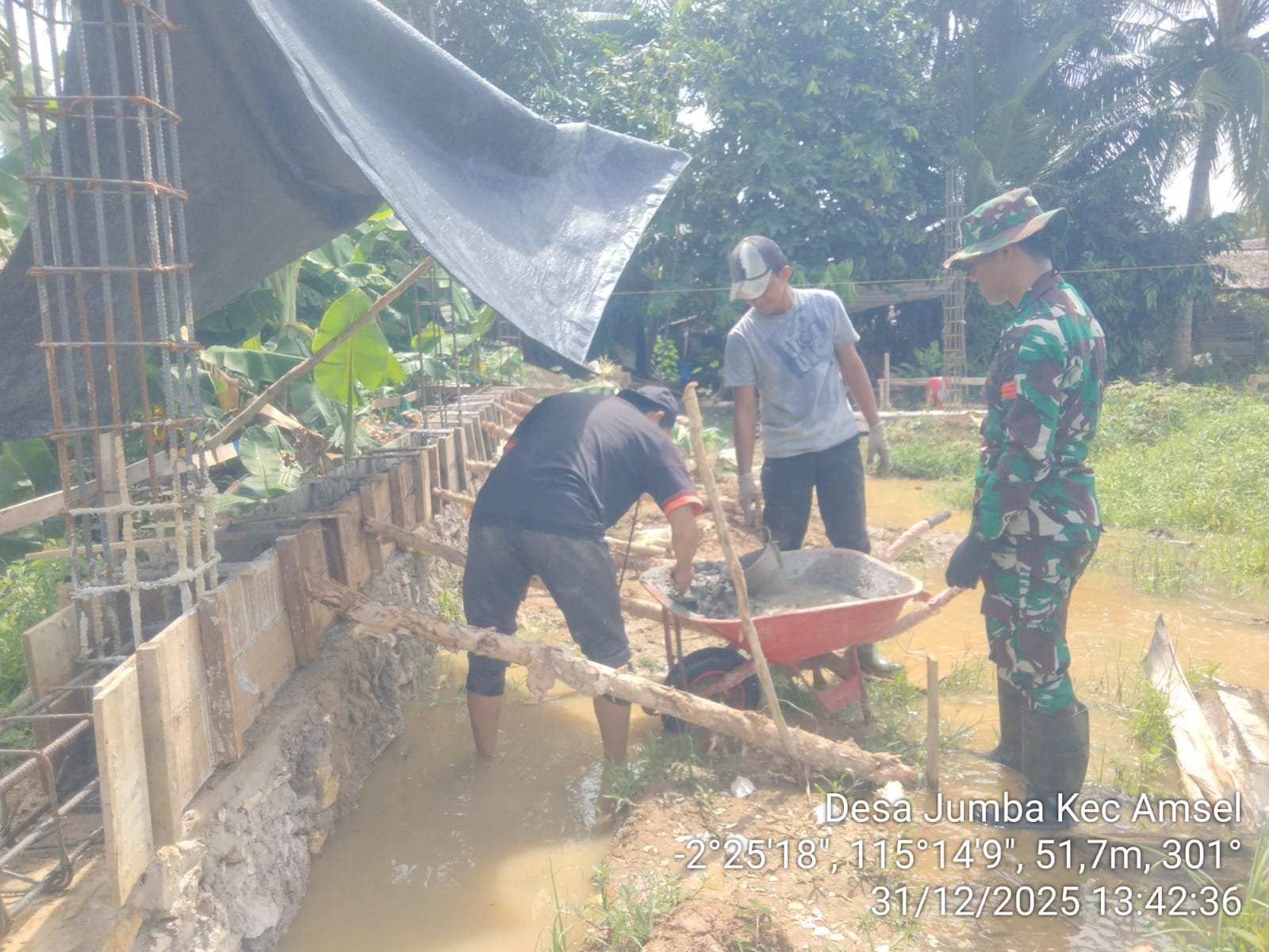 Kegiatan pembangunan tersebut berlokasi di Desa Jumba, Kecamatan Amuntai Selatan, Kabupaten Hulu Sungai Utara. Pada hari ini, personel TNI bersama masyarakat melaksanakan pengerjaan pengecoran sloof sebagai bagian dari tahapan struktur bangunan.