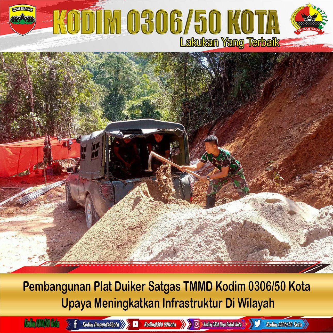 Pembangunan plat duiker yang juga merupakan sasaran fisik program TMMD Kodim 0306/50 Kota. Dimana pembangunan plat duiker ini perlu dilakukan sebagai tempat mengalirnya air sehingga tidak merusak jalan yang saat ini sementara dirintis Satgas TMMD Kodim 0306/50 Kota.