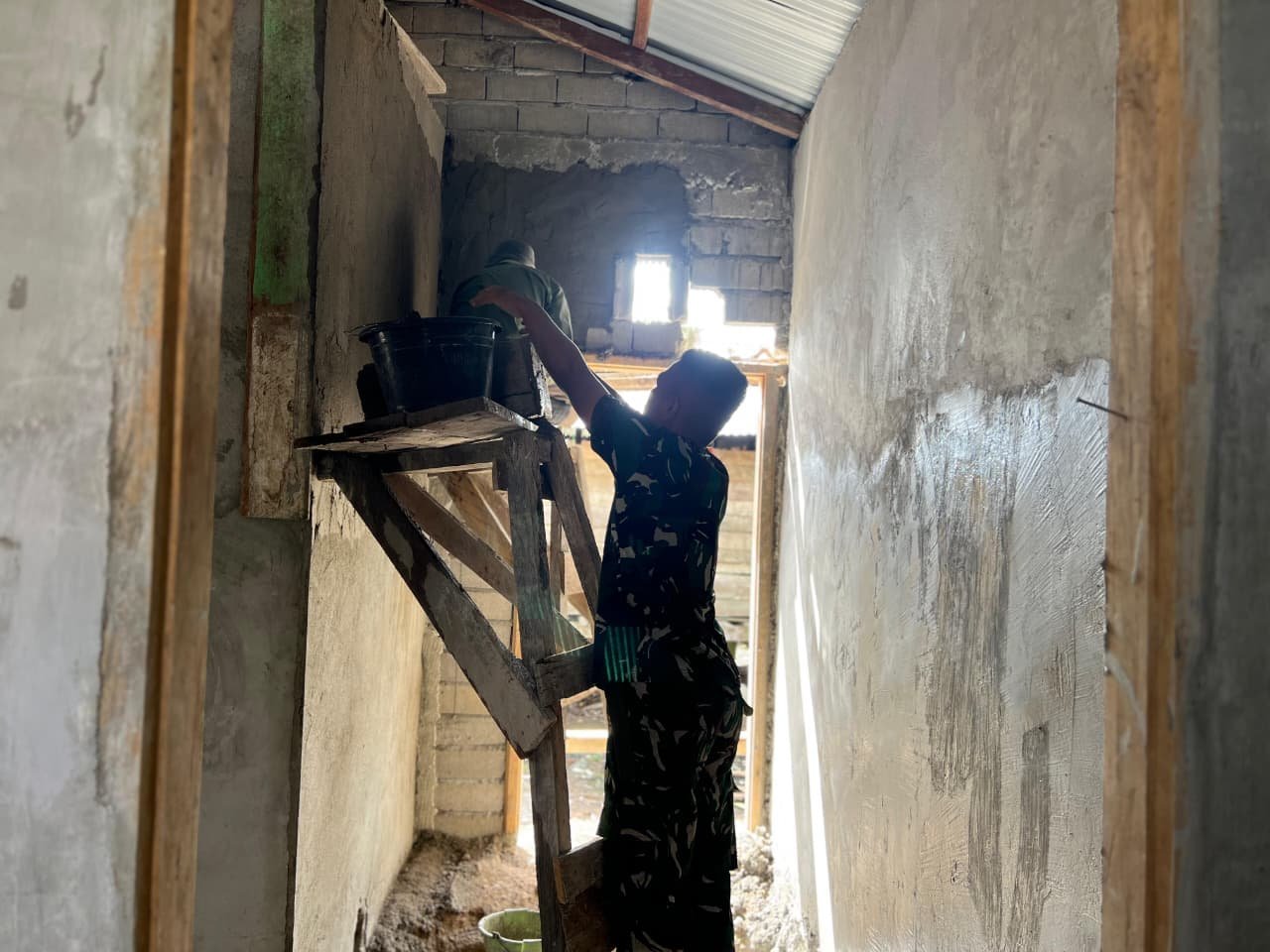 Personel Tentara Nasional Indonesia yang tergabung dalam Satgas TMMD bersama masyarakat terlihat kompak melaksanakan pembangunan rumah. Pekerjaan difokuskan pada pemasangan dinding, penyempurnaan rangka bangunan, serta penataan bagian dalam rumah agar segera dapat digunakan oleh penerima manfaat.