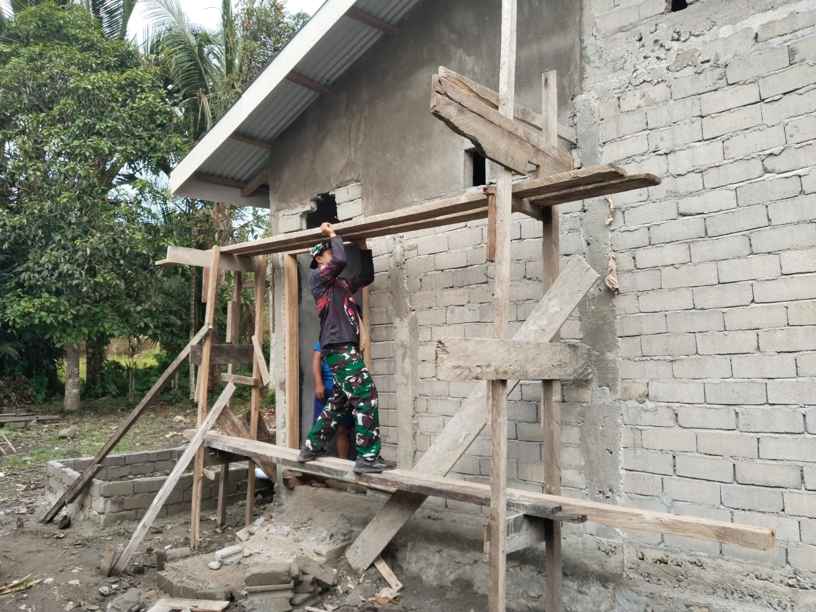Personel Tentara Nasional Indonesia yang tergabung dalam Satgas TMMD bersama warga setempat terlihat kompak melaksanakan pengerjaan. Tahapan pekerjaan difokuskan pada penyempurnaan struktur bangunan, pemasangan dinding, serta penataan bagian dalam rumah agar segera dapat ditempati.