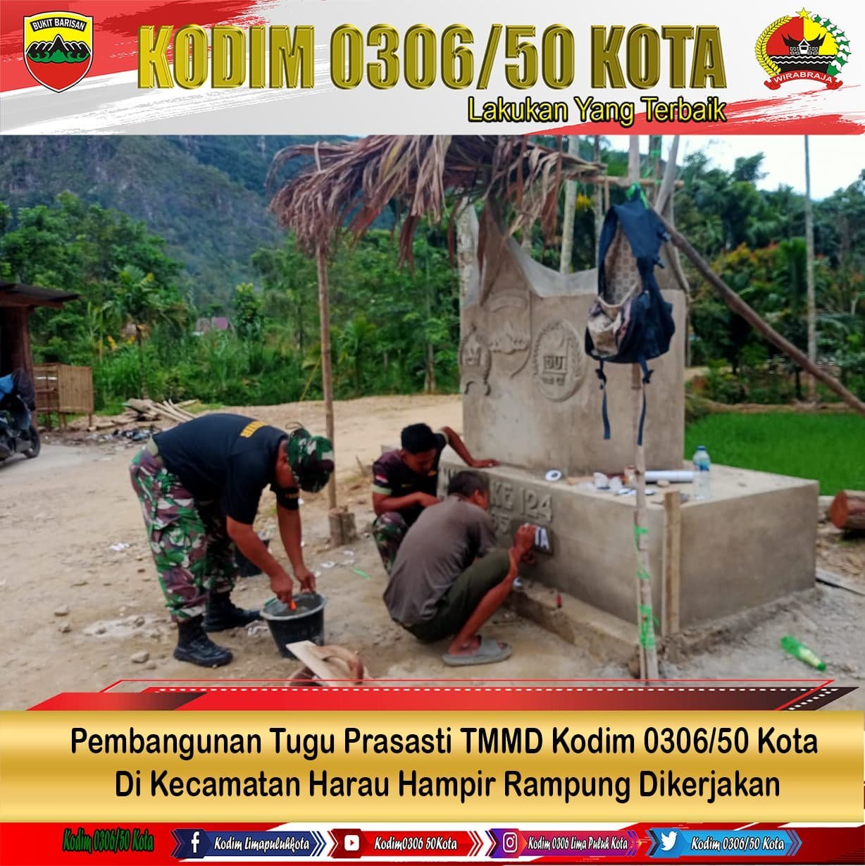 Lima Puluh Kota — Hingga hari ini, anggota Satgas TMMD Ke 124 Kodim 0306/50 Kota dan masyarakat masih melanjutkan pekerjaan, tidak terkecuali pengerjaan pembangunan tugu prasasti TMMD di Nagari Harau Kecamatan Harau Kabupaten 50 Kota. Senin. (26/5/2025).