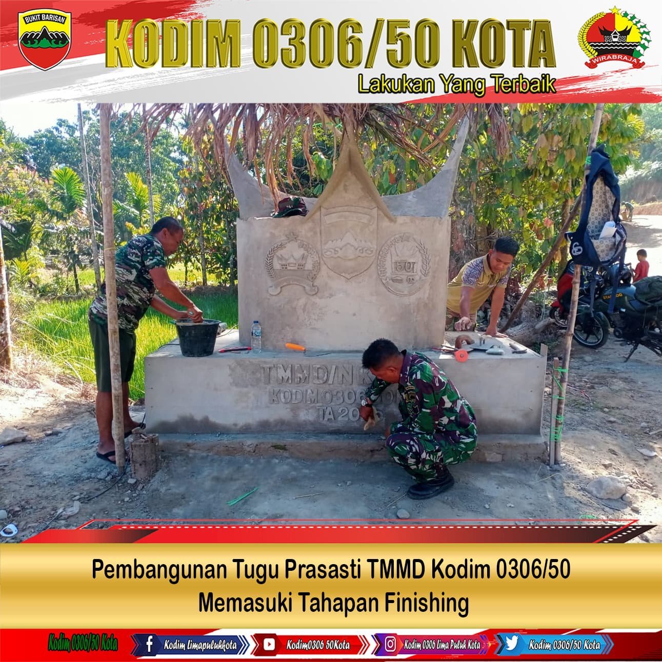 Lima Puluh Kota — Pembangunan Tugu Prasasti TMMD Kodim 0306/50 Kota di titik nol jalan penghubung antara Jorong Landai dan Jorong Harau Nagari Harau Kecamatan Harau Kabupaten 50 Kota sudah memasuki tahap finishing, Rabu (28/5/2025).