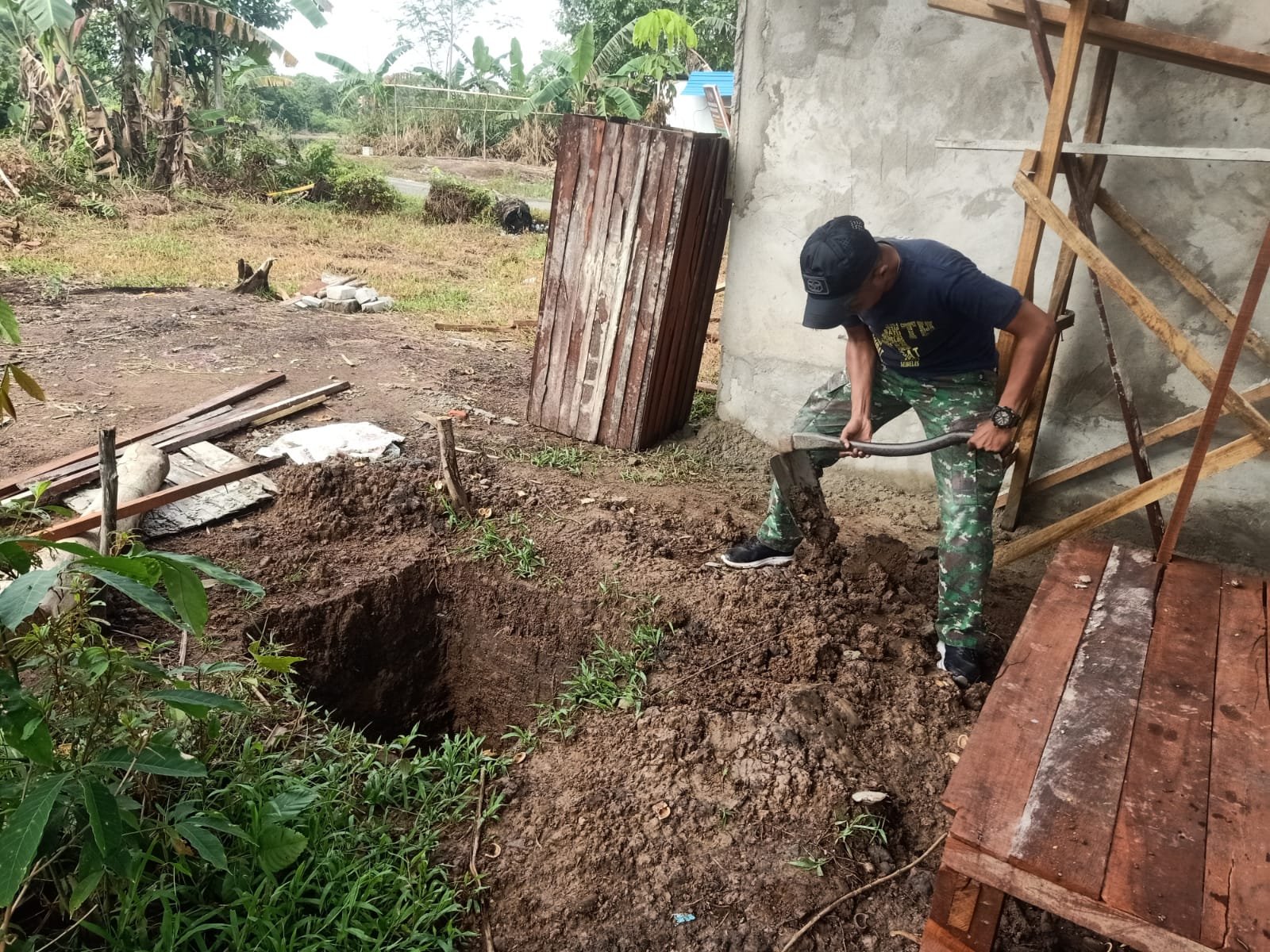Peltu Gatot, anggota tertua Satgas TMMD Ke-126 Kodim 1005/Barito Kuala, terlihat aktif membantu penggalian lubang septic tank.
