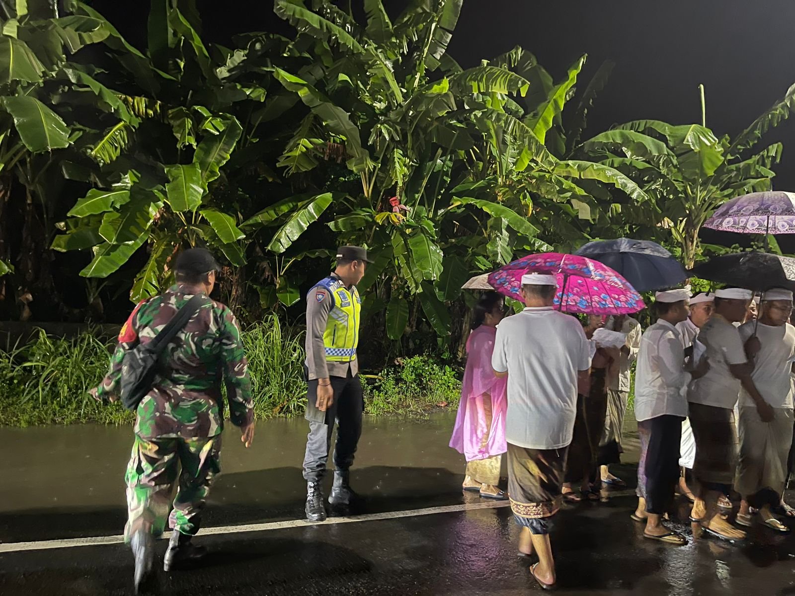 Ditengah gerimisnya hujan, tampak Serka hamid bersinergi bersama Bhabinkamtibmas dan pecalang begitu sigap memberikan pengawalan dan pengamanan berlangsungnya persembahyangan warga dan sesolahan Sang Hyang Jaran yang dilaksanakan di di perempatan Desa Adat Kutampi.