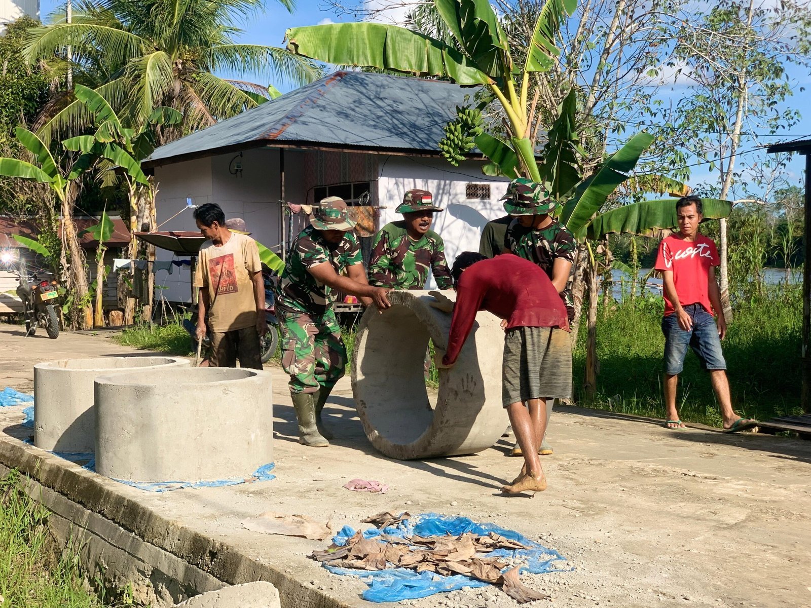 Pengangkutan coran untuk sumur galian di Desa Talio, Kecamatan Karau Kuala, Kabupaten Barito Selatan, menjadi aktivitas vital yang dilakukan Satgas TMMD Reguler ke-124 Kodim 1012/Buntok bersama warga. Medan berat membuat pengangkutan coran harus dilakukan dengan penuh kehati-hatian dan kerja sama.