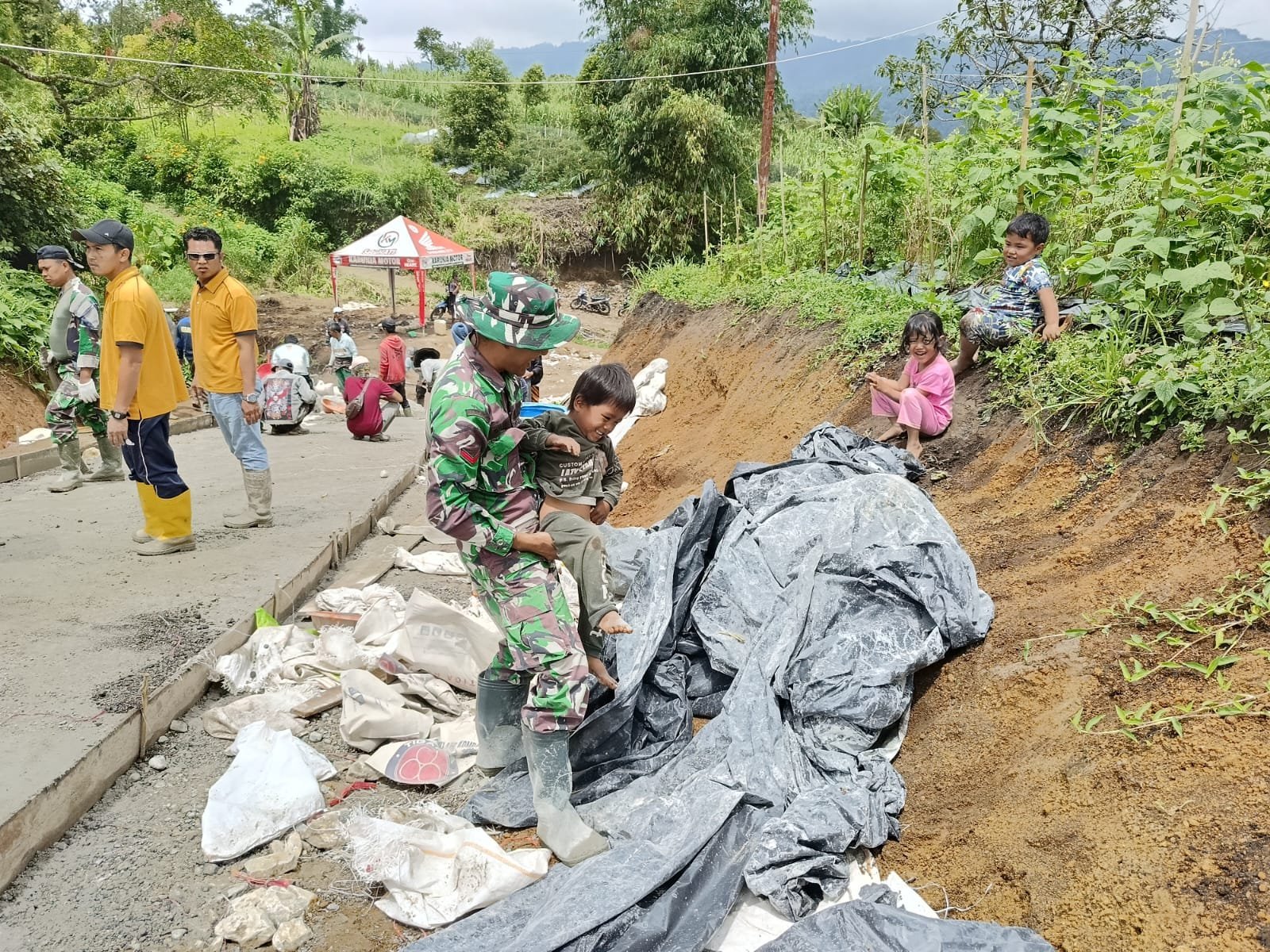 Di sela-sela kesibukan menyelesaikan pengecoran, anggota Satgas TMMD tetap menyempatkan waktu untuk berinteraksi dengan anak-anak di sekitar lokasi. Mereka bermain, bercanda, dan berbagi cerita, menciptakan suasana akrab antara TNI dan masyarakat.