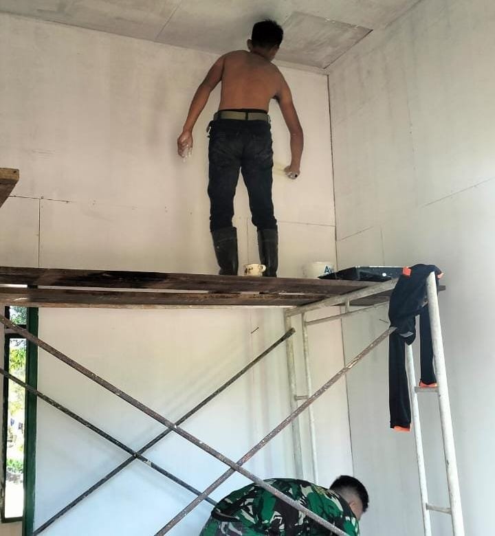 KUTAI TIMUR – Rumah milik Rahman, seorang kuli bangunan di Desa Suka Rahmat, Kecamatan Teluk Pandan, kini mulai tampak rapi dan tertata setelah dinding dalam, luar, serta plafonnya tersapu plamir. Hasil yang mulai terlihat ini menjadi akibat dari kerja keras Satgas TNI Manunggal Membangun Desa (TMMD) Ke-125 Kodim 0909/Kutai Timur yang memacu tahapan pengerjaan rehabilitasi Rumah Tidak Layak Huni (RTLH).
