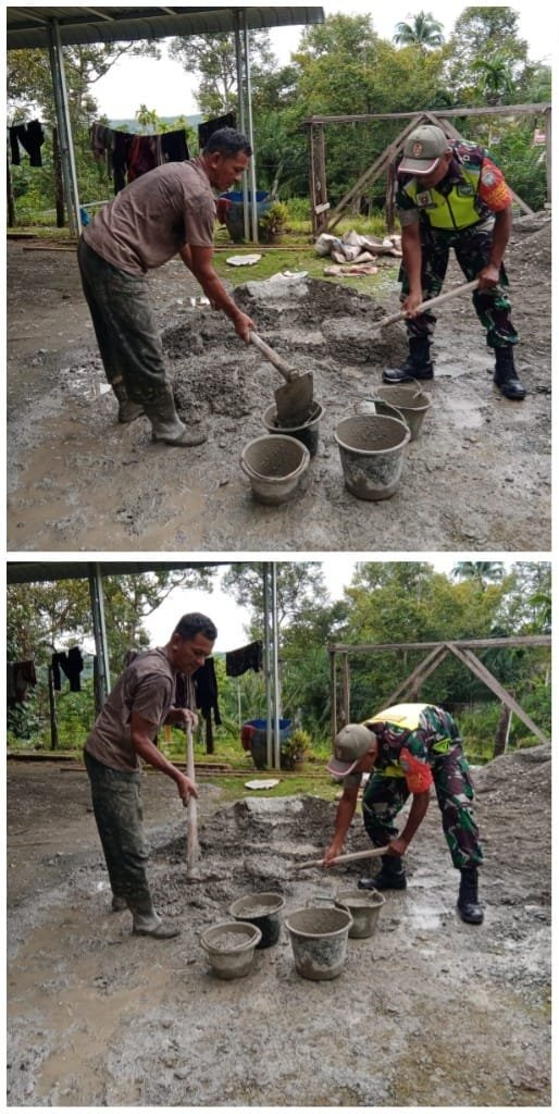 ACEH BARAT – Berperan aktif dalam membantu membangun rumah warga, Babinsa Koramil 01/Sungaimas Kodim 0105/Abar, Serda Yuslianto, melibatkan diri secara langsung dengan membantu mengaduk semen untuk mengecor lantai rumah milik salah satu warga yang tinggal di Desa Geudong, Kecamatan Sungaimas, Kabupaten Aceh Barat, Kamis (05/02/2026).