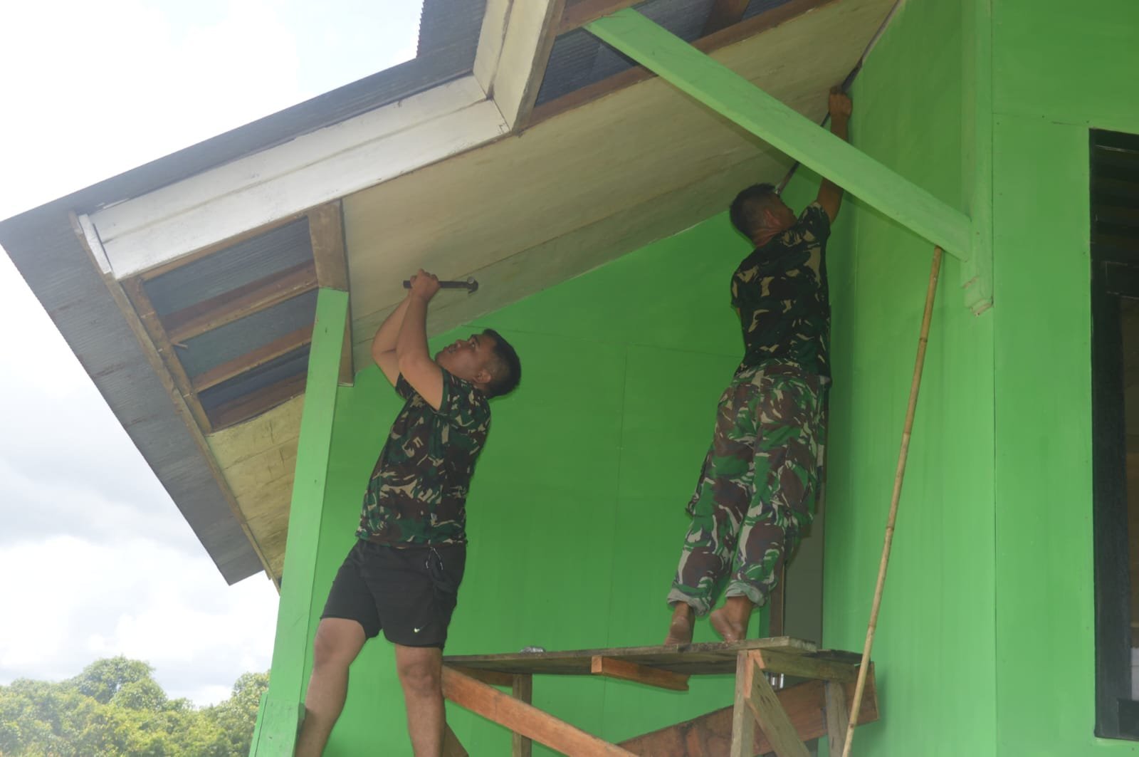 “Prajurit Satgas bekerja dengan penuh semangat memasang satu per satu plafon mushola. Pengerjaan yang telah dimulai sejak kemarin terus dikebut agar segera rampung,” tambahnya.