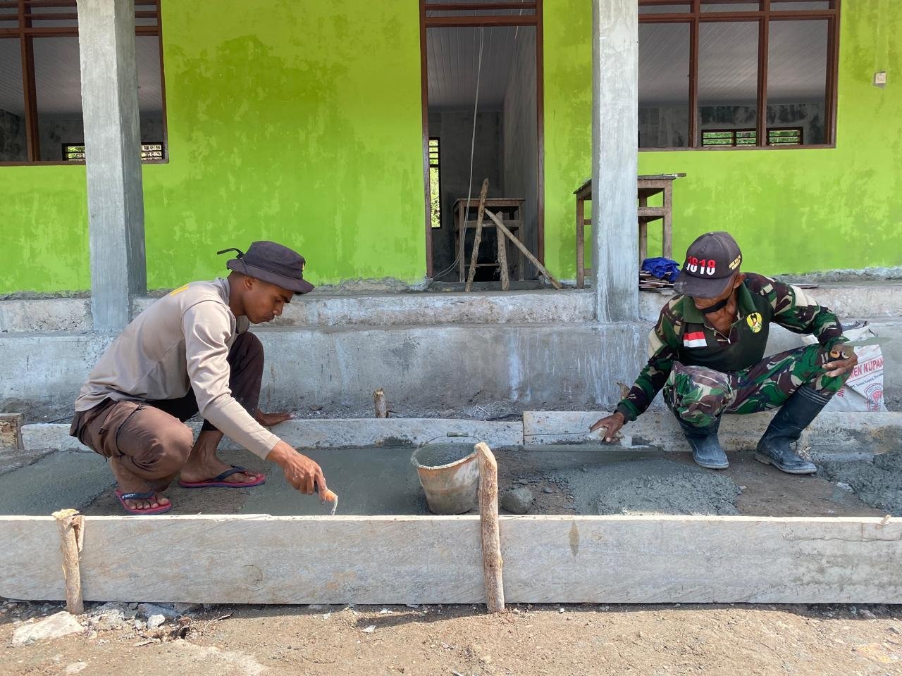 Sejak pagi buta, suara alat kerja mulai menggema di sekitar lokasi pembangunan. Para personel dan warga saling bahu-membahu menyusun batu sebagai pondasi, lalu melanjutkan pengecoran untuk memperkuat struktur halaman sekolah. Dengan penuh ketelitian, mereka memastikan setiap material terpasang rapi agar halaman menjadi kokoh dan tidak mudah rusak saat musim hujan tiba.